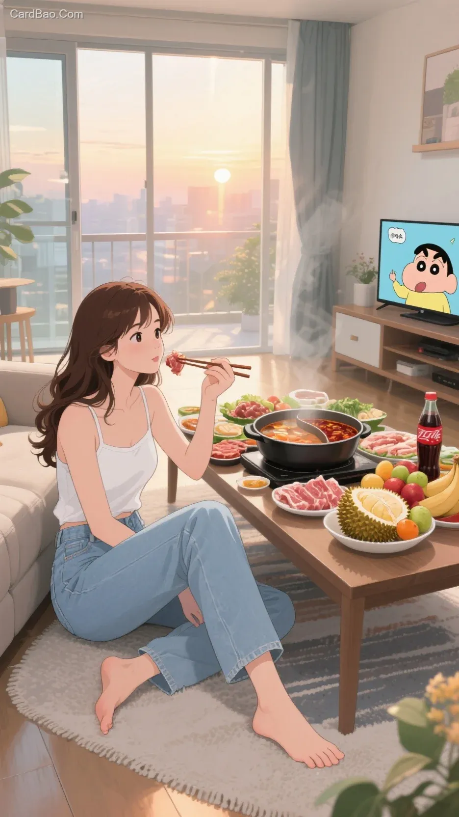 治愈系动漫插画风格,早晨,玻璃幕墙折射夕阳暖光,一个现代女孩,漂亮,25岁,白皙,气质,清纯,五官精致,女生妆容漂亮,黑棕色的长卷发,白色的吊带短袖,浅蓝色的高腰牛仔裤,光脚坐在沙发旁边的地毯上,茶几上摆满了火锅食材和一个鸳鸯锅,果盘里放了剥开的榴莲和水果,还有可乐,女孩用筷子夹着肉,房间的电视机正在播放蜡笔小新,整个画面非常惬意