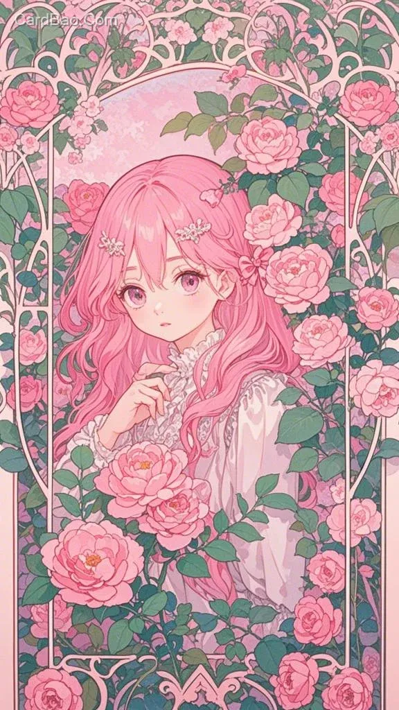 Ghibli style, Mucha style, watercolor style, line art, intricate, flat illustration style, pen illustration, delicate, refined line drawing, plants, roses, a beautiful girl with pink hair hidden among the roses, detailed, anime, pen drawing, decorative art, expressive lines, well-balanced density, rhythmic composition.