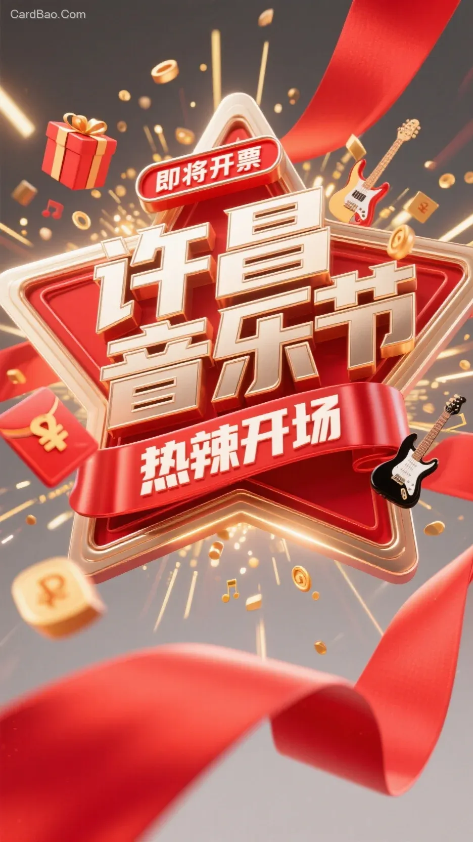 现代电商促销主题字体设计海报,上边平行四边形框中(红色底色/金属边)一行小字:“即将开票”,中间是超大立体金属字"许昌音乐节",下部绶带形状上文字"热辣开场"。文字下方是多层不规则六角星形框架(红色底色/金属边);背景爆炸金属粒子特效(金色光斑/速度线/动态模糊)辐射状扩散(渐变/光尘颗粒)环绕式购物元素(漂浮的礼盒、红包、人民币符号/电吉他,/音符,);字组周围有三条红色飘带,画布底部角落有一条倾斜的动感模糊的红绸。色彩方案:红灰色渐变主色调,质感层次:金属拉丝纹理+磨砂玻璃效果+全息反光光影控制:顶光投射+地面反射光+文字自发光文字透视布局(近大远小/30度倾斜角度)信息层级划分(主标题>促销语>品牌信息>