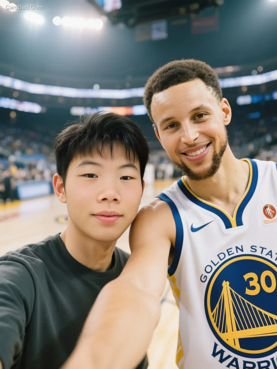 一共2个人,一个人是参考图片中的人发型不要变,另一个是史蒂芬库里,地点是勇士主场