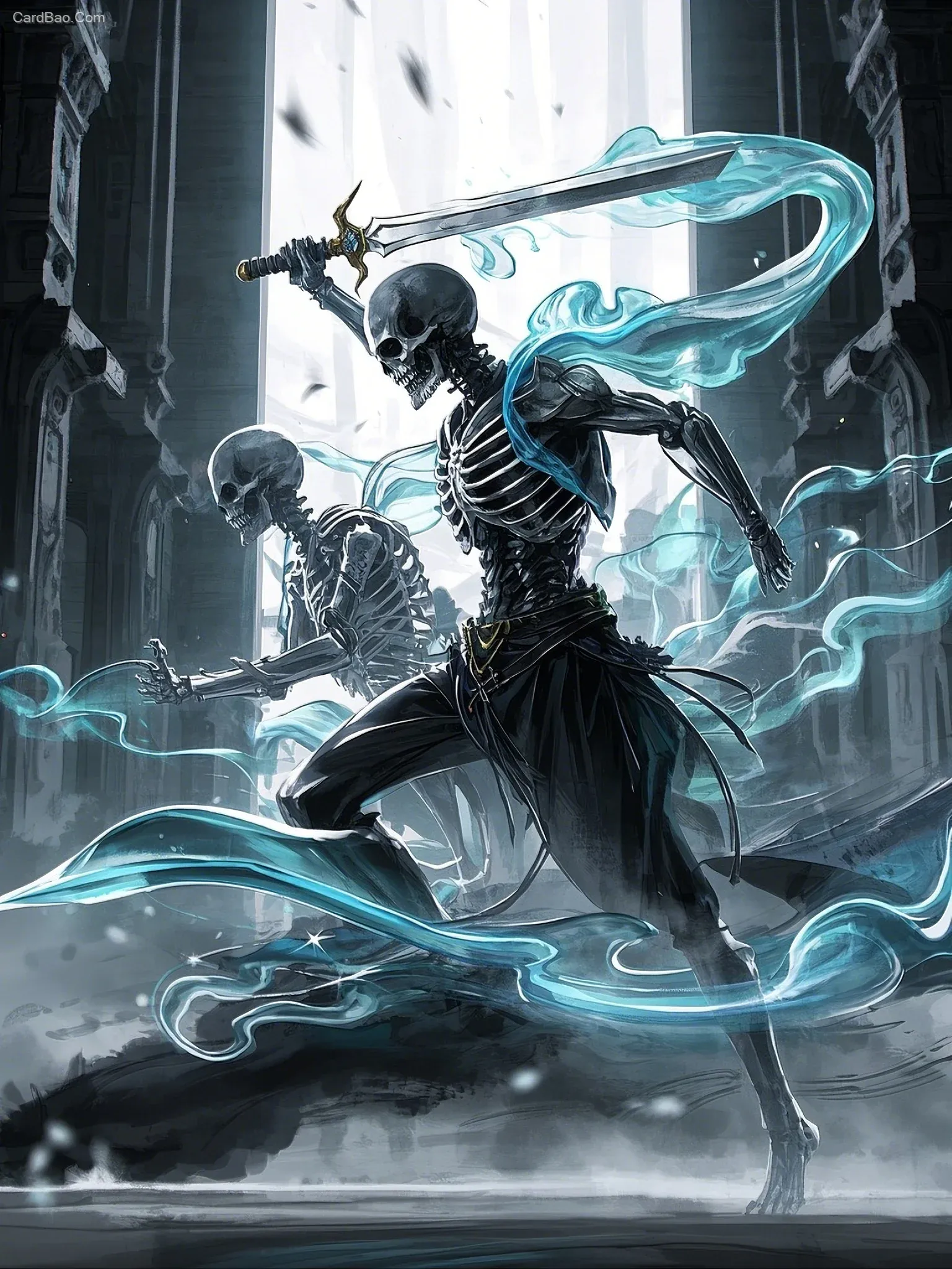 水墨画,由霓虹烟雾形成的几具骷髅战士,透明,高速从右向左狂奔,清晰的上半身前倾,下半身因速度模糊,带出残影,速度感强,动感模糊,高举大刀长剑向前砍。线条像水流般柔和自然悠长,意识流,极简,水墨意境,烟雾质感,梦幻,超现实主义,唯美,拖影,拉丝,禅意,空灵,抽象。背景是巨大的灰暗的古代建筑。粒子流体,线条优美,三维建模,32K超高清细节,大师杰作,电影级别。