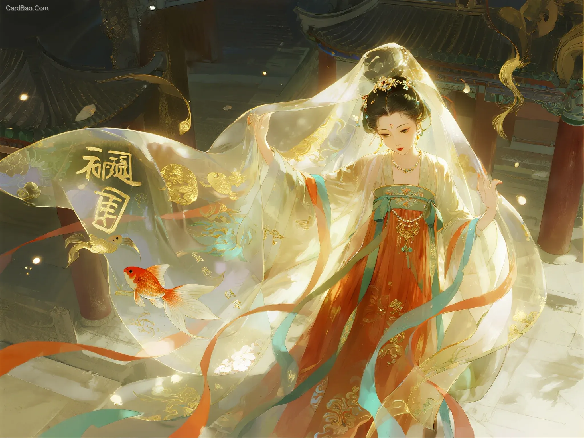 古风美人 丝绸披帛吉祥字样 金鱼戏云纹 透明金光丁达尔 航拍视角