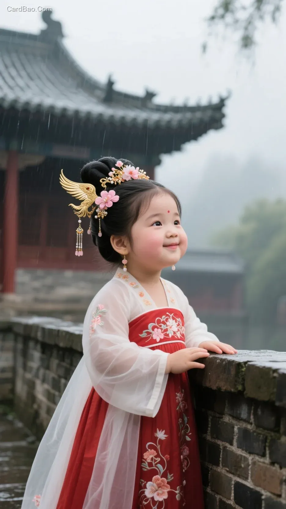 以下是一段适合生成此类古风可爱人物场景的提示词:在古雅的中式建筑前,一位身着传统汉服的可爱大唐胖公主小女孩,梳着精致古典发髻,插饰华丽金钗、粉花与凤形步摇,耳畔坠着小巧耳饰。她身穿红底绣花襦裙,外搭半透白纱披帛,倚在古朴砖石围栏上。天空带着朦胧烟雨感,营造出悠远的古典氛围,着重刻画她圆润可爱的面庞、生动的神态,让画面既有传统国风韵味,又充满童真俏皮,展现出独特的东方美学意境 。