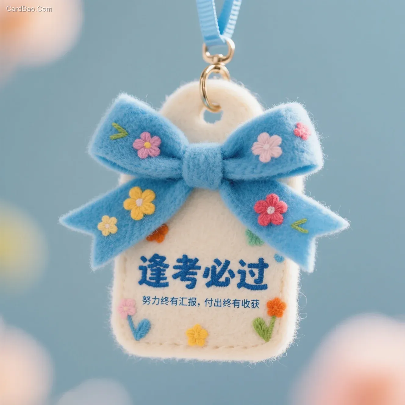 创意吊卡设计,毛绒材质,毛毡艺术,蓝色的绸带挂扣,旁边有彩色花朵点缀,上面刺绣文字“ 逢考必过”,下面极小的副标题“努力终有汇报,付出终有收获。”,高清渲染
