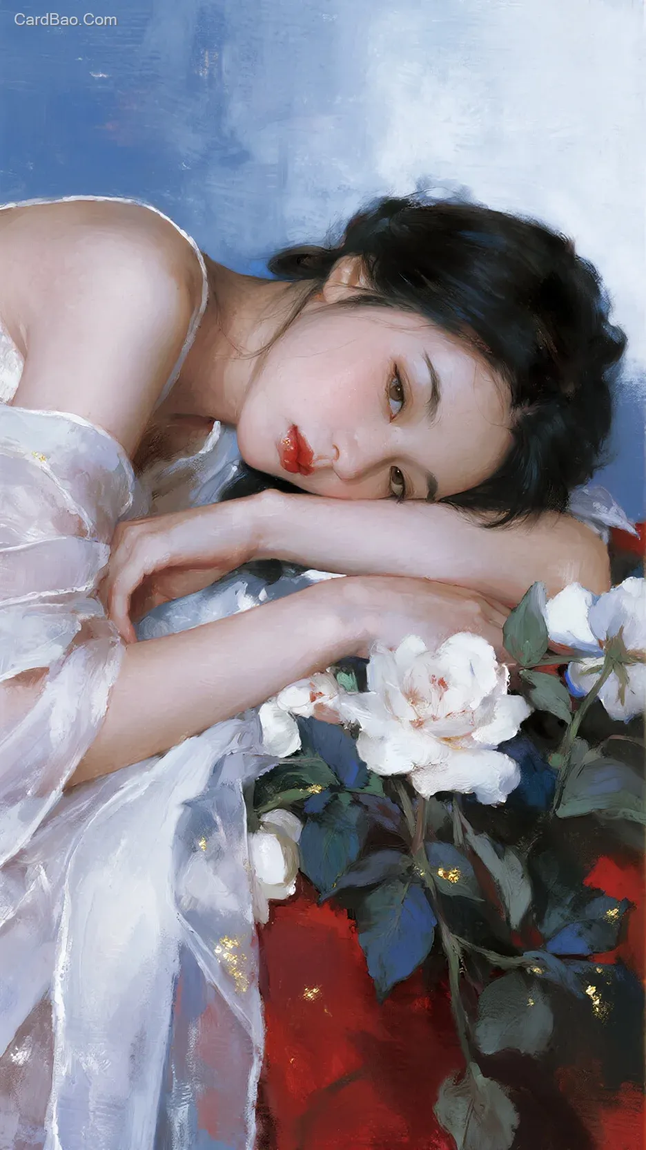 - **细节**:透纱披帛缠绕臂间,露珠从指尖将落未落