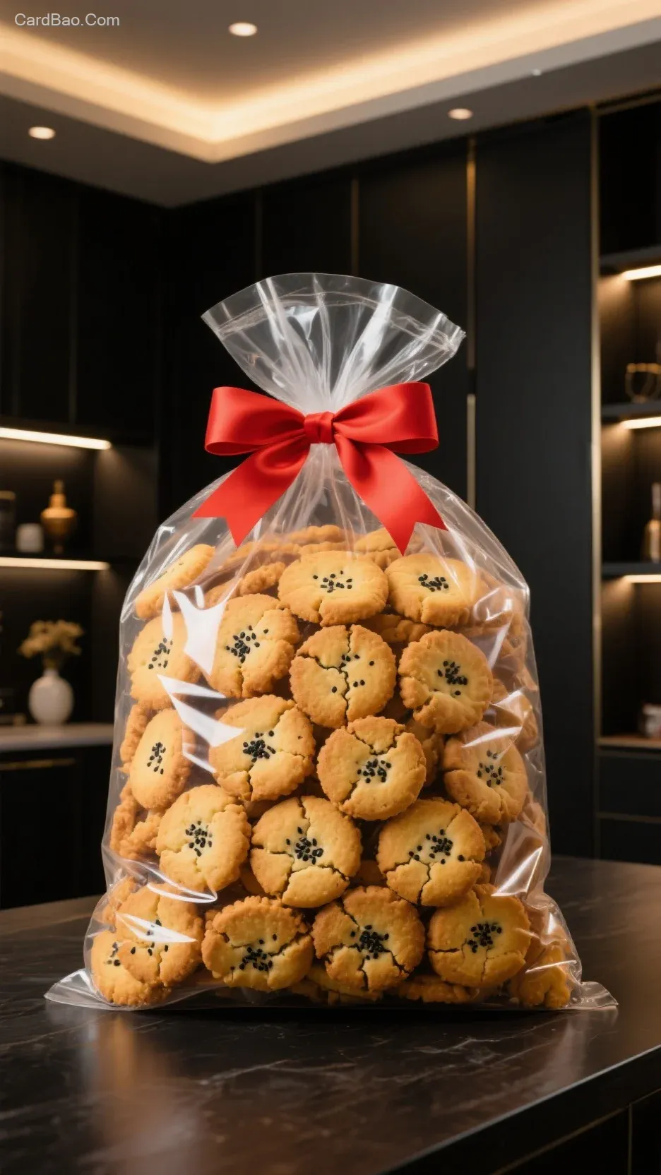 画面主体是一超级大一袋包装精美的500个桃酥。透明塑料袋里装满色泽金黄的桃酥,每块桃酥表面都点缀着乌黑的芝麻,裂纹自然,呈现出烘烤后的焦香质感。袋口系着鲜艳的红色蝴蝶结,为这份香甜添了几分精致。