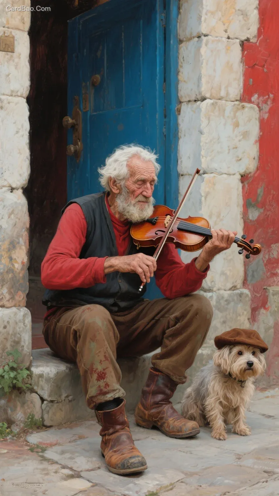 红蓝配色,一位白发苍苍、满脸皱纹的老人,身着陈旧的红色长袖内搭、深色背心和褐色裤子,脚蹬棕色旧靴,正蹲在石质建筑门口拉小提琴。旁边一只毛发蓬松的小狗,头上戴着一顶棕色帽子,安静陪伴,整体画面呈现出写实油画质感,氛围沧桑而温暖 。
