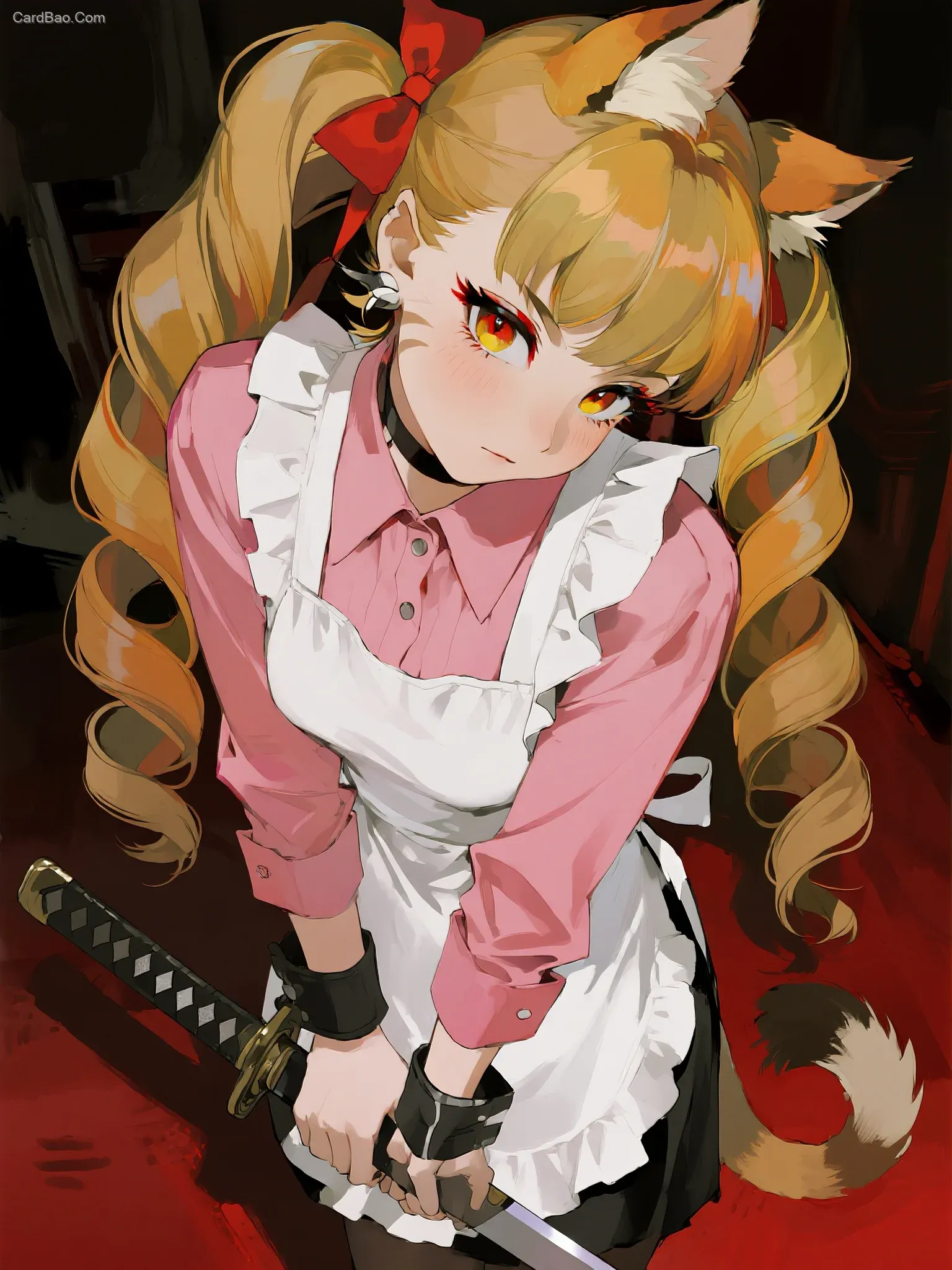 低角度,侧视,下垂眼,慵懒的感觉,电影感和强烈透视感。浅玫红色,琥珀色,黑白。时尚感兽耳女郎,坐姿,衣服褶皱,明暗对比,婴儿肥,低头,浅玫红色衬衫蕾丝边白围裙装,忧郁表情,琥珀色空气齐刘海,夸张长度的双马尾垂到腰部,粗大的螺旋双马尾末端蝴蝶结,一手按着腰上的刀鞘,一手捏着头发丝。琥珀色瞳孔,强调眼部,眼部特写,眼线眼影,半身肖像。夸张的五官,jojo的奇妙冒险风格作品,红睫毛,水粉水彩笔触。丙烯颜料厚涂法哑光质感纯色昏暗,背景。