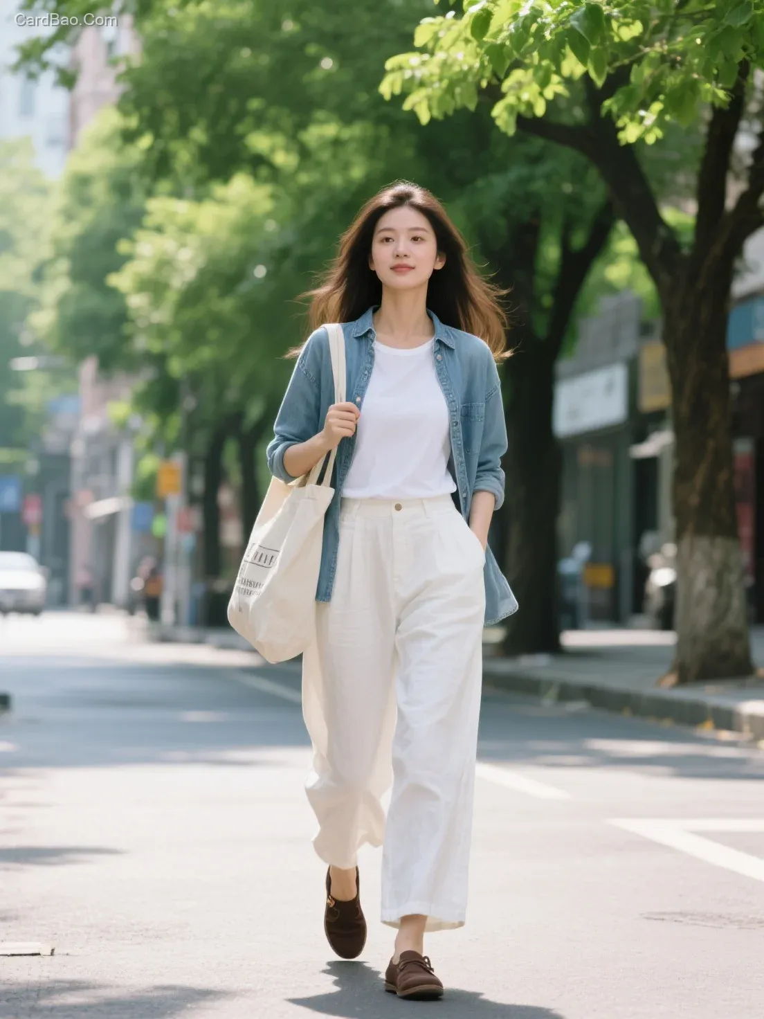 Set in an urban street with trees, their leaves glowing green, a beautiful woman with long flowing hair, a sweet face, and delicate features exudes grace and elegance. She carries a canvas bag over her shoulder, wearing a white round-neck T-shirt, a thin denim shirt, and white linen wide-leg pants. On her feet are stylish dark brown women's shoes, giving off a strong artistic and literary vibe. The scene is filled with a cinematic atmosphere, artistic and aesthetically pleasing. The shot is a wide-angle, full-scene view with a unique perspective, high-definition, and resembles a real-life portrait or photography work. The colors are vibrant, with strong contrasts and a cinematic texture.
