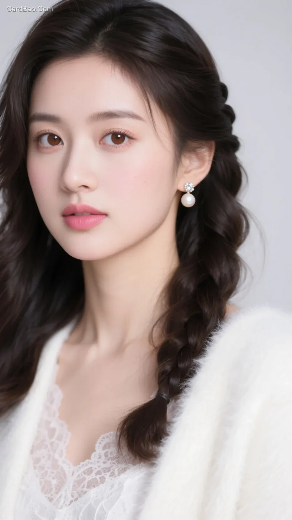 一位年轻女性,乌黑长卷发做优雅编发造型,弯眉自然舒展,双眸是清澈明亮的棕色调,唇妆为自然裸粉色,佩戴精致珍珠钻石耳饰。身着白色毛绒质感外套,内里搭配细腻蕾丝,背景是简洁浅灰色,光线柔和均匀,呈现高清细腻、真实感十足的画面效果 。