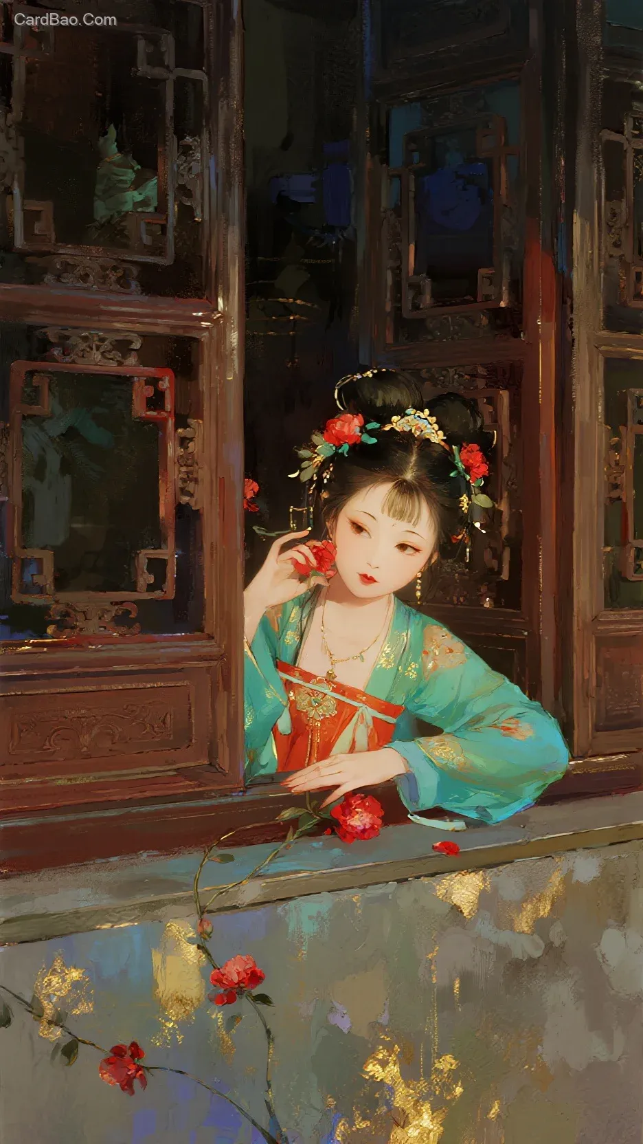 国风油画重彩,女孩,唯美深色,复古窗台雕花镂空,特大幻想,海棠红,金边效应,意境深远,高清画质。岩彩色彩饱满,色彩晕染,笔触细腻,水墨渲染