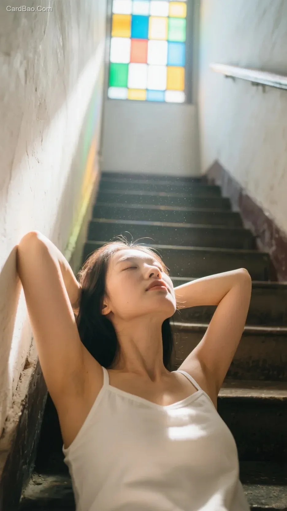 30岁美女,性感妩媚,穿着白色吊带背心,坐在旧式公寓楼梯间靠墙休息,清晨阳光从楼梯天井复古的彩色玻璃透入,双手交叉枕在脑后,抬头闭眼享受阳光。尘埃在光束中可见,画面以局部特写拍摄手臂肌肉与面部光影,采用胶片颗粒风格与自然退色