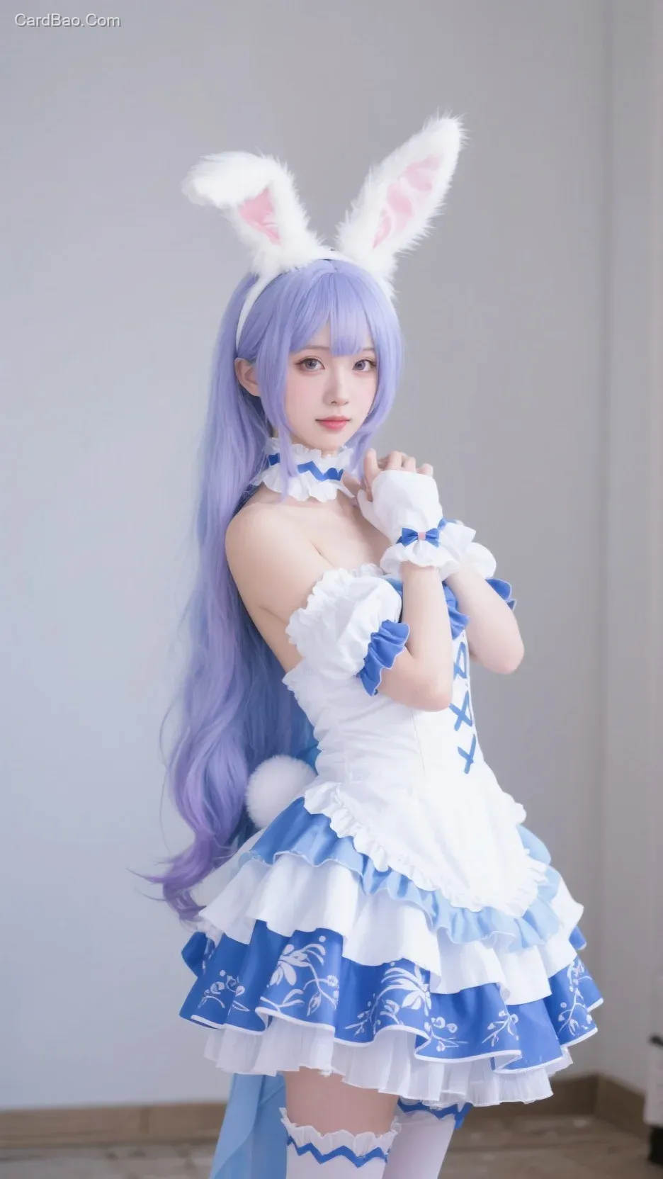 A young woman with light blue-purple long hair (wearing a white fluffy rabbit ear hair accessory), dressed in blue and white cosplay-style clothing (with patterns and ruffled decorations), in an indoor setting (minimalist background), presenting a cosplay style.