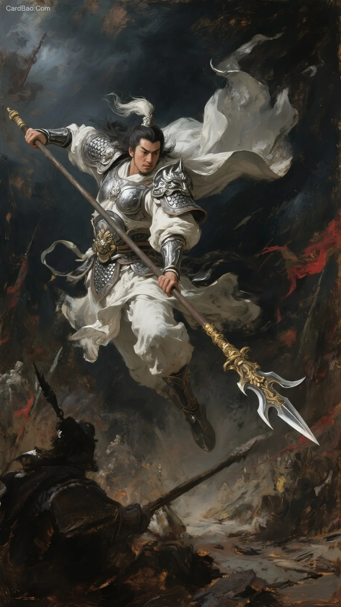 幻质感,对比色点缀,极繁主义,史诗感,故事感,场景感,磨砂肌理,笔触粗犷而不失细腻,大师级写意构图,强调意境,色调对比强烈。主题:赵云,手握方天画戟,飞起突刺,白袍银甲,油画写实风格伦勃朗油画风格暗黑