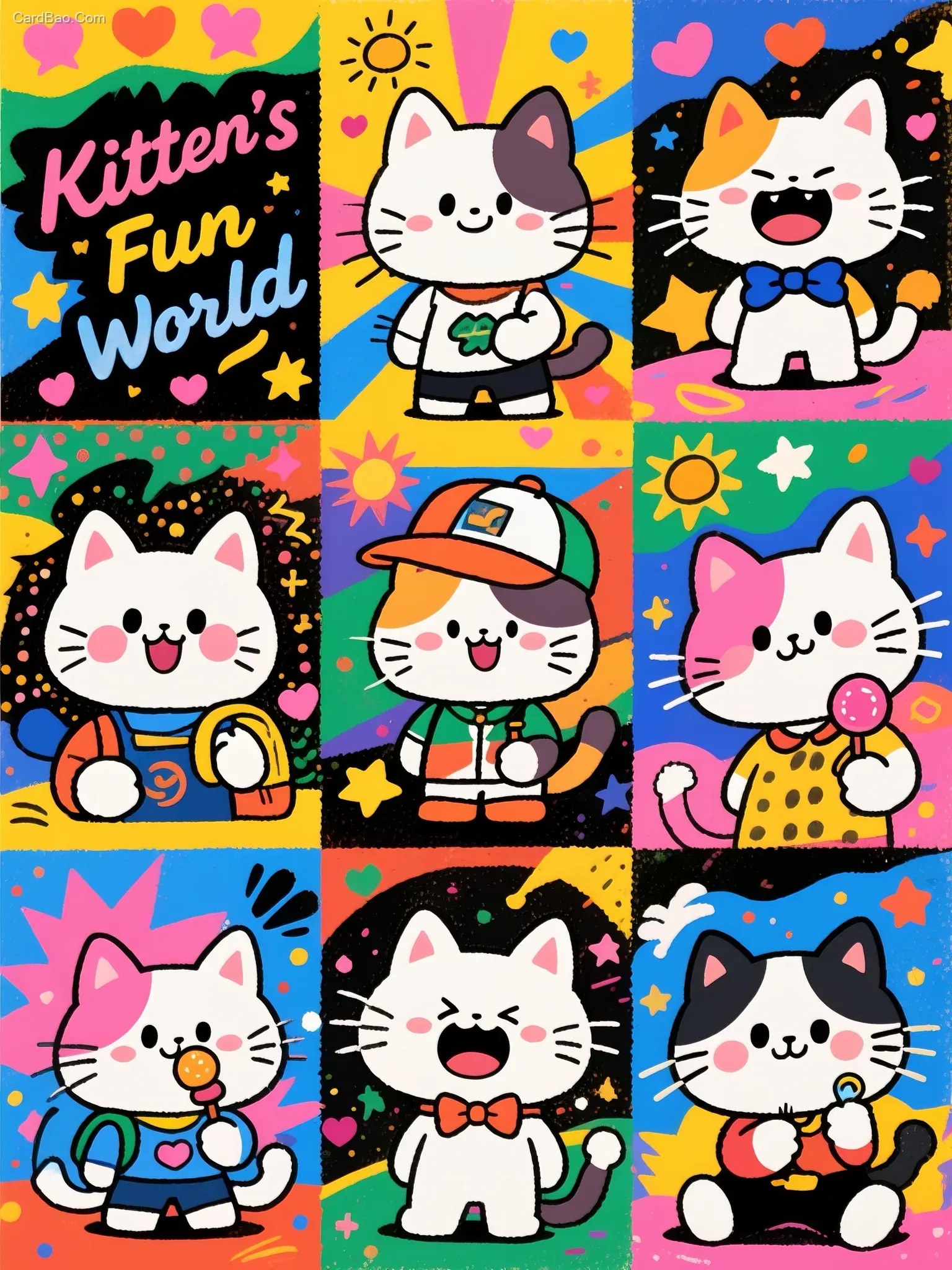 ##以儿童蜡笔画的风格绘制可爱小猫形象插画,多巴胺配色,手绘质感,颜料肌理感,运用高饱和度色彩、几何图形元素,背景添加太阳,星星等抽象图案,画面可配上独特文字,营造活泼有趣的视觉效果。