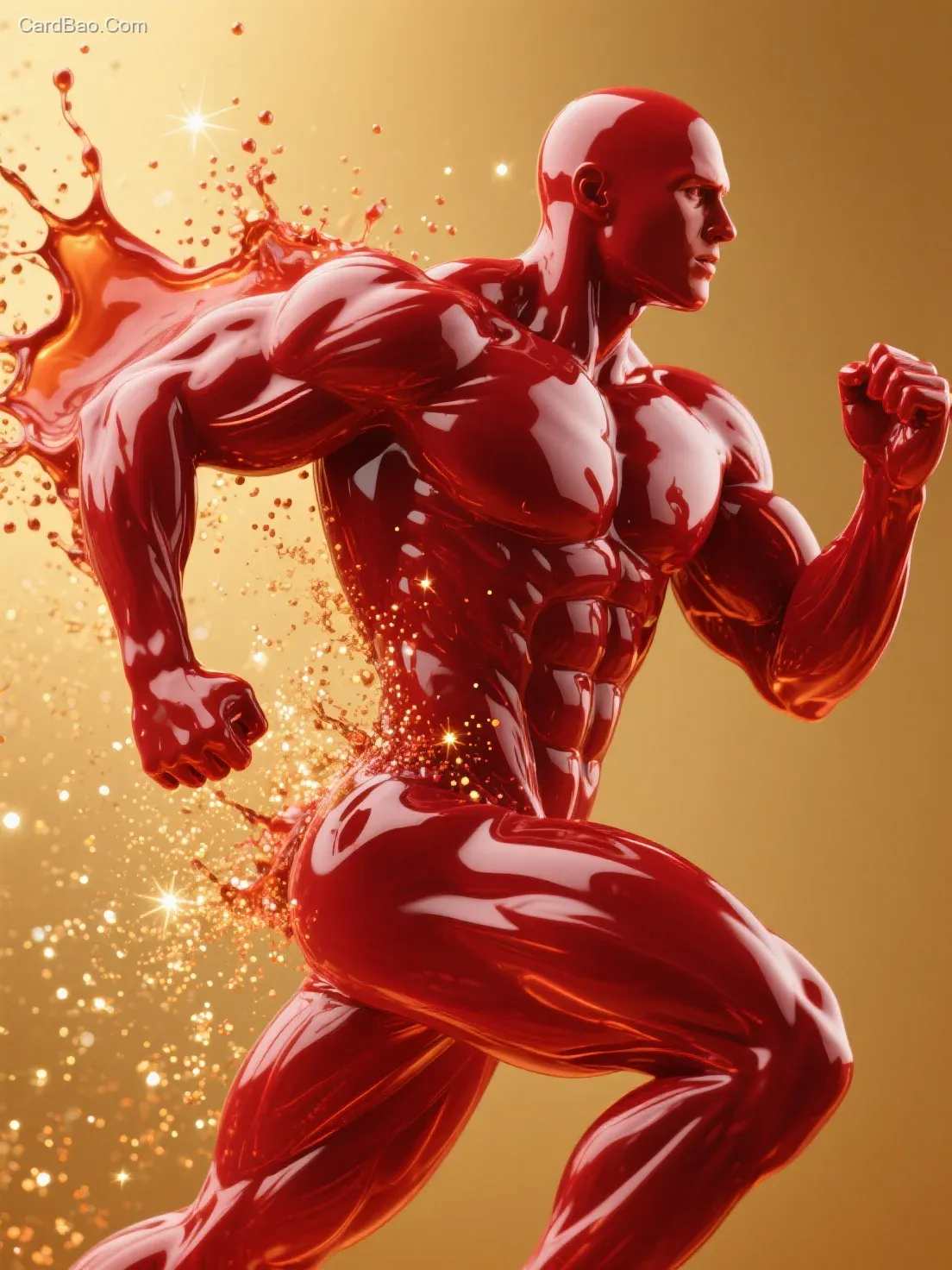 酒红色糖浆液态物质组成的跑步的人体(肌肉健美冠军身材健硕无体脂),运动状态,微小的闪光粒子从身体后喷溅而出,磨砂颗粒质感,抽象,磨砂颗粒金色背景,8k超高清画质。