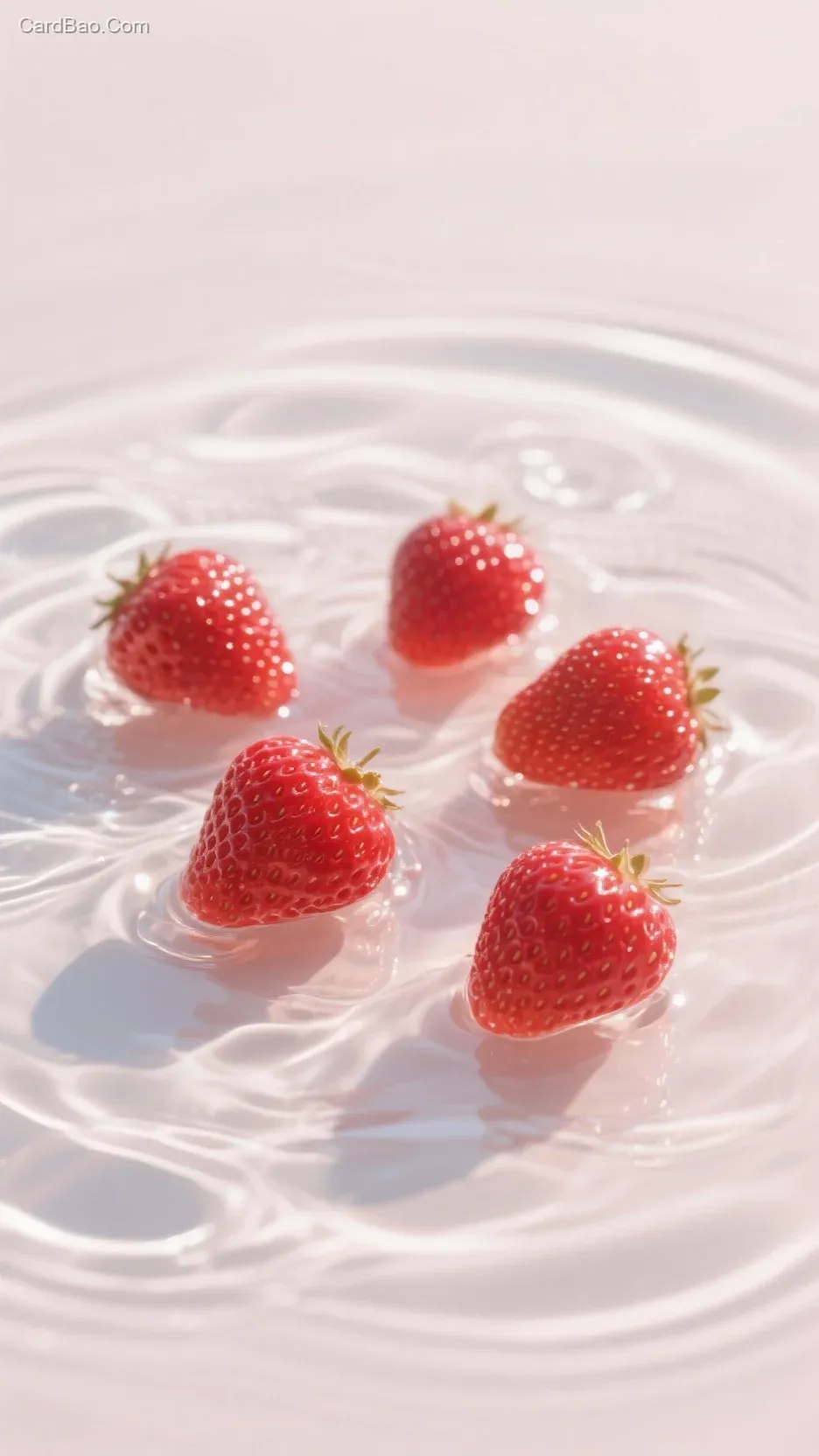 几颗闪烁的草莓,浅色调,透明浅红色,水,波纹,极简主义