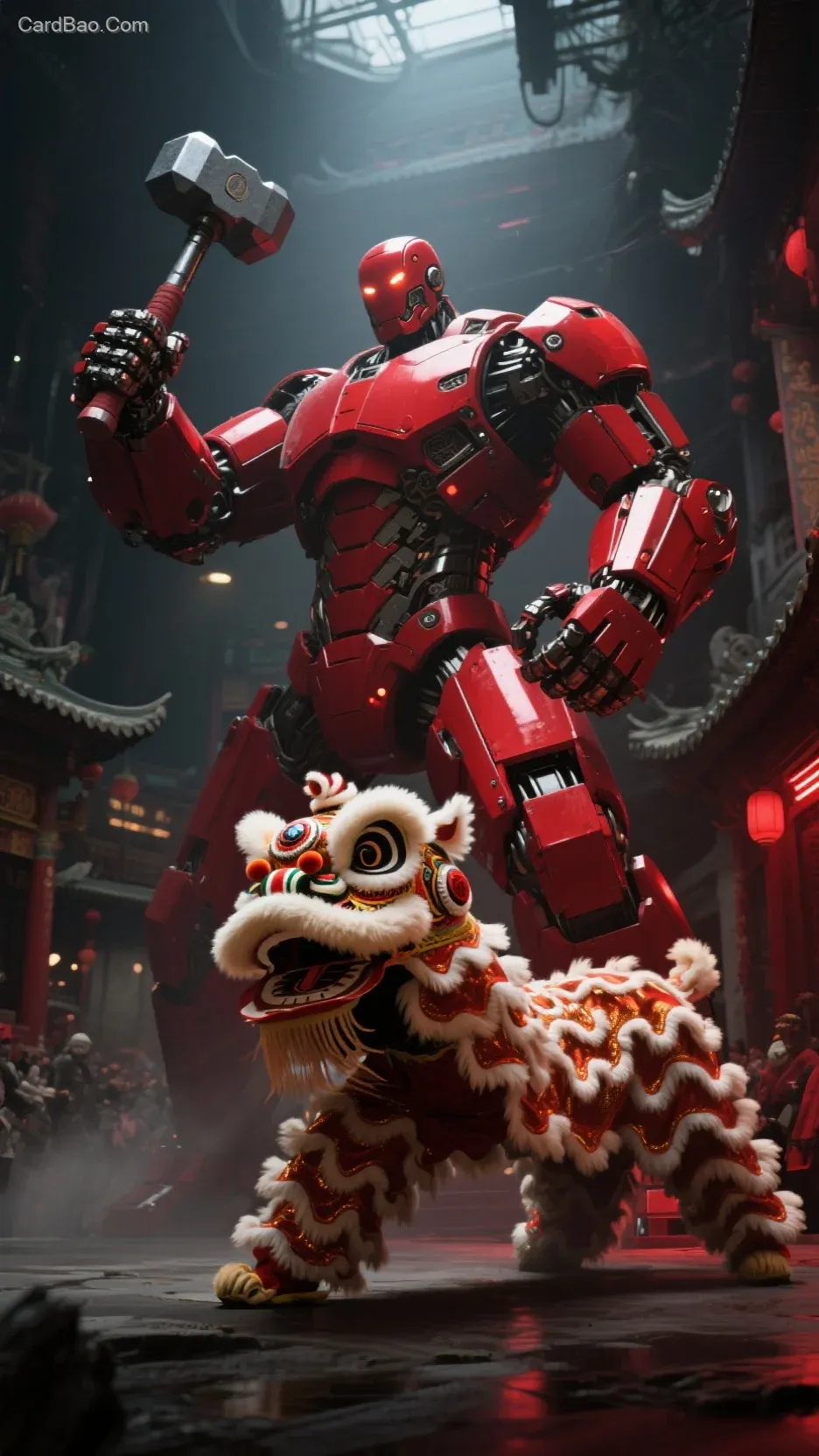 The red steel giant is holding a hammer in its right hand, performing a lion dance in Foshan.