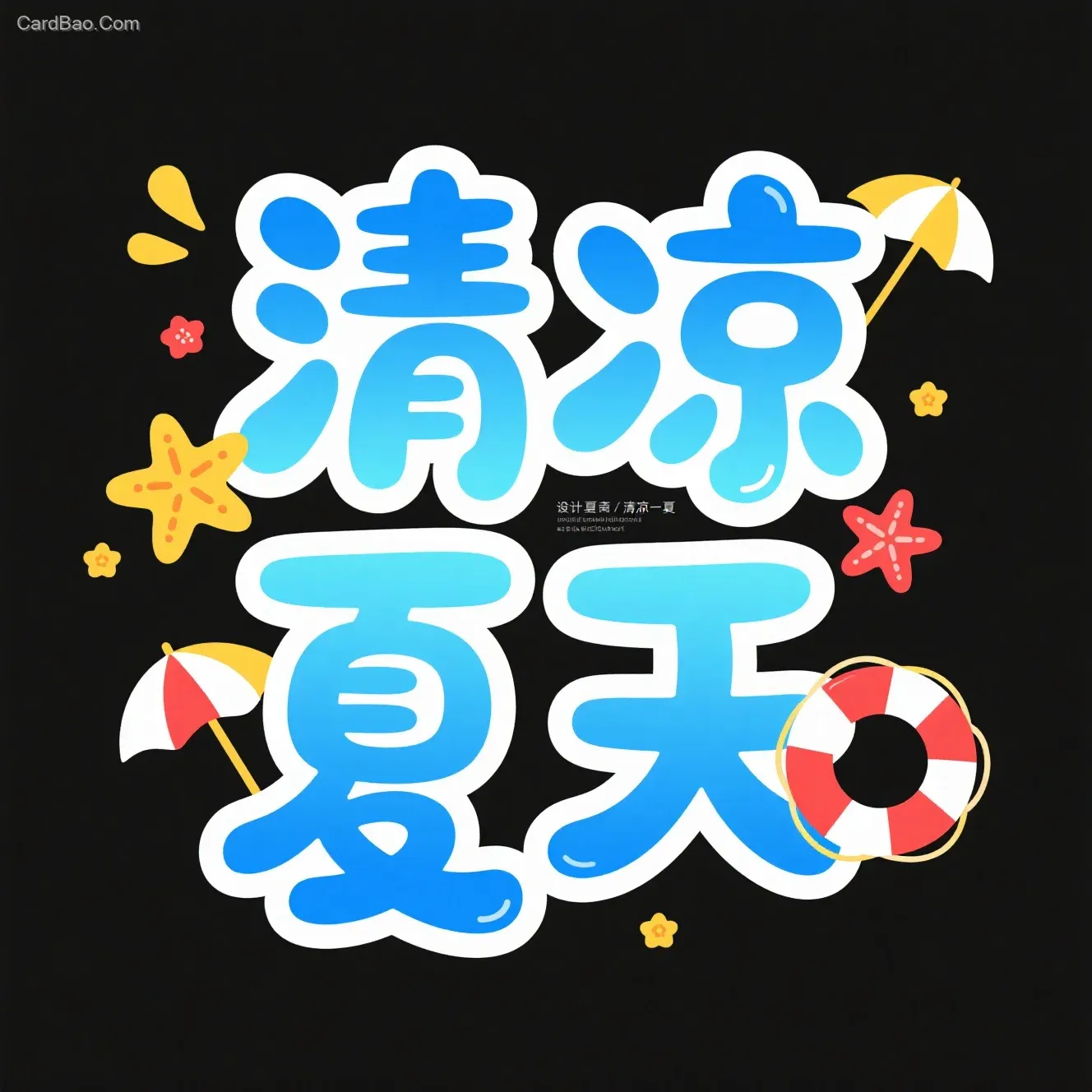 卡通童趣风格字体,主题 “清凉一夏”,圆润饱满笔画,蓝白渐变,搭配沙滩伞、海星、救生圈装饰,色彩明快活泼,夏季氛围浓厚,黑色背景突出元素