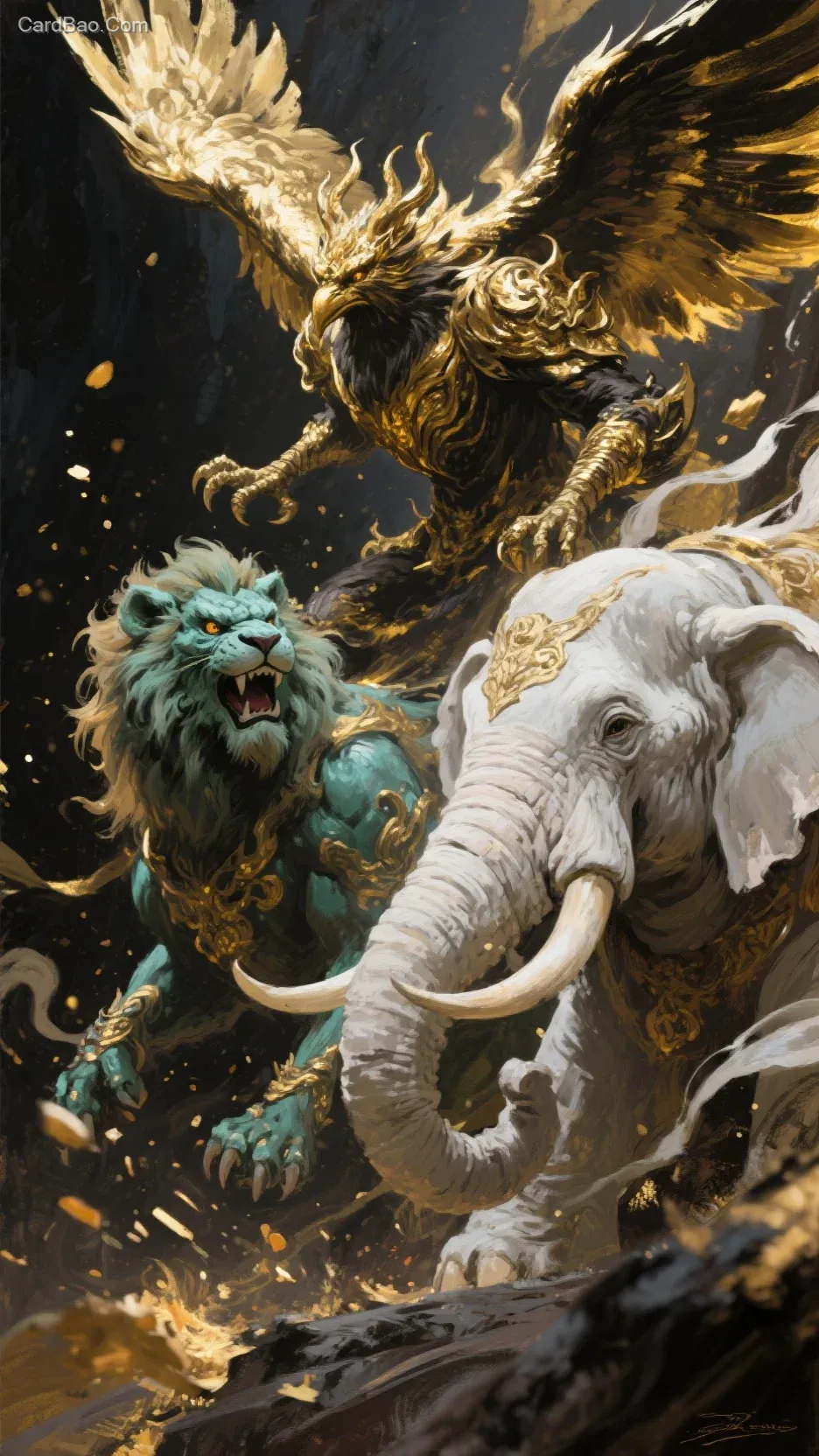 帮我生成一张图片:油画,特写,视觉冲击,金银黑,粗旷,oc渲染,浅景深,虚实层次,完美光影,西游记之大鹏魔王,青狮魔王,白象魔王,笔触飘逸,高清,粒子飞溅,大师作品。