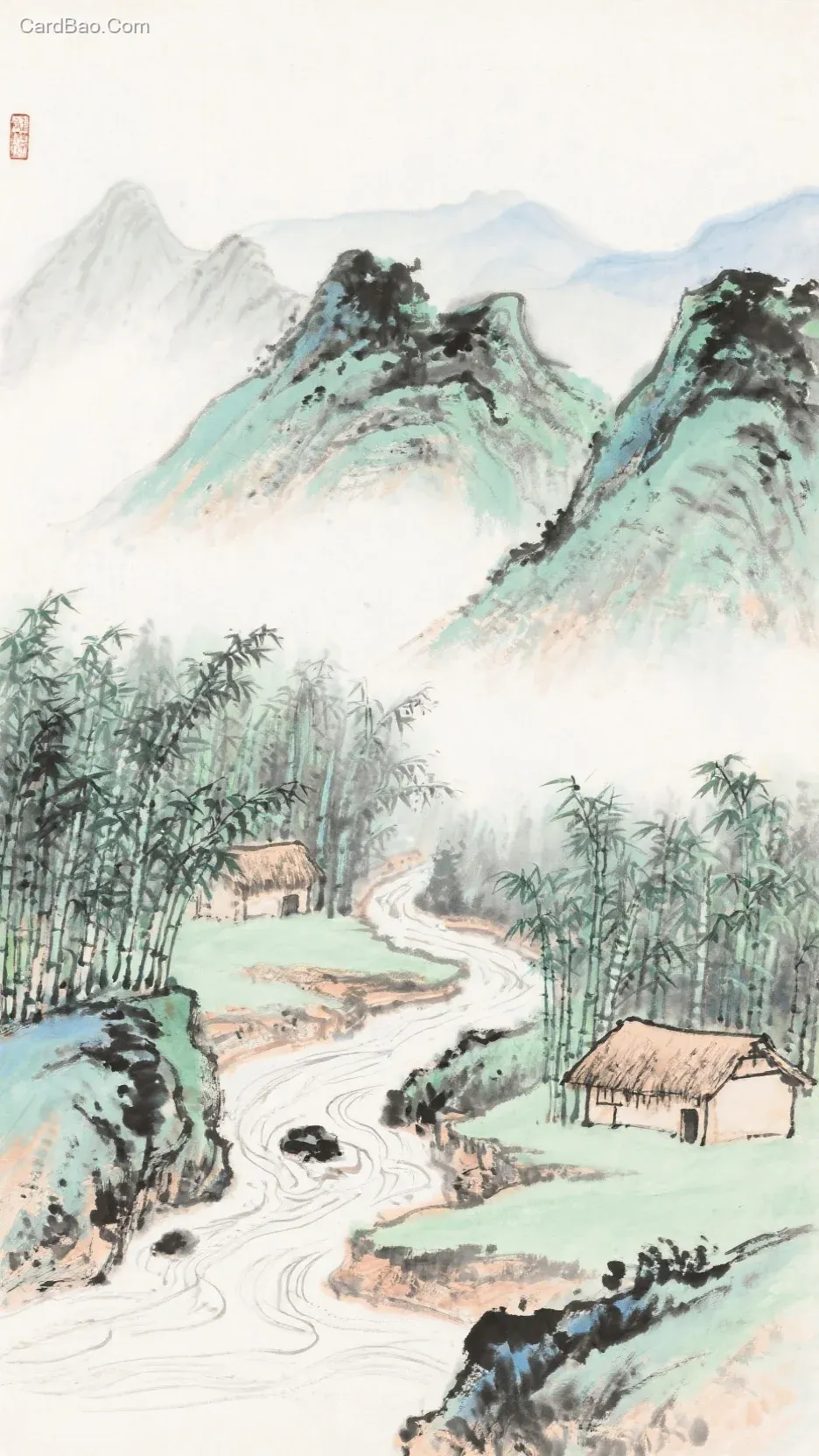 Ink and color landscape painting, requirements: freehand style, featuring mountains and water, bamboo groves, and houses with inhabitants.