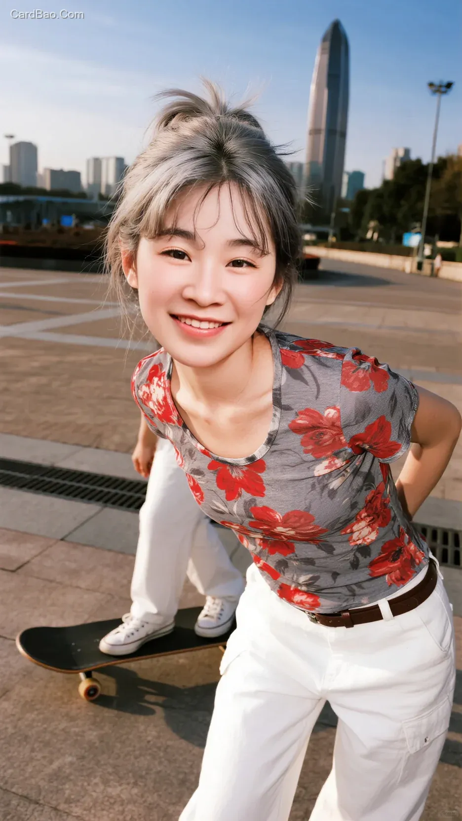 ##一个活泼可爱漂亮气质佳的中国女人,20岁,妆容精致,灰白色头发在头顶束起来,大眼睛,笔挺小巧鼻子,樱桃小嘴巴,身宽松灰红色暗花图案T恤衫,白色麻料宽松的休闲阔腿裤,白色运动鞋,她在广场玩滑板,远远的是中信广场。