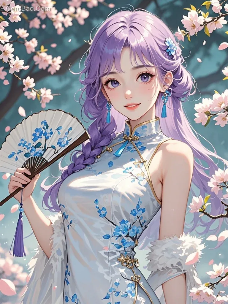动漫风格,长发卷发紫发少女,面容精致,眼神温柔带浅笑,中式旗袍,旗袍主体,手持折扇,樱花盛开场景,樱花枝桠环绕,花瓣飘落,柔和明亮光线,浅色调背景,站立,美腿,高清画质,锁骨,光影交错,唯美,二次元,现代风格,数字艺术风格,彩铅画,淡雅色调、柔美神秘。8K。梦幻,悲伤,忧郁,浅色系,抽象艺术,近景,大家闺秀,气质,旗袍保守,不要太暴露,温婉
