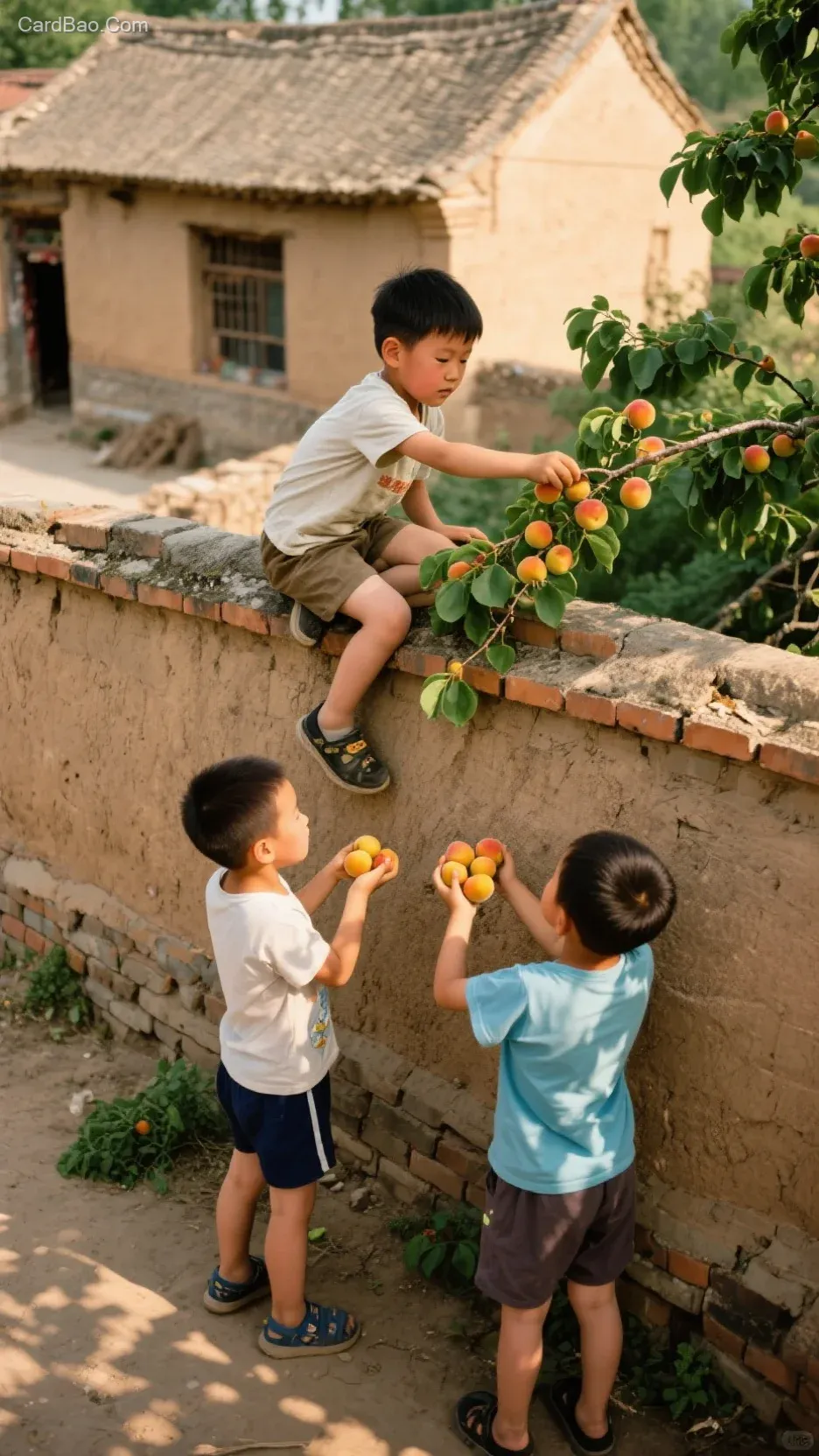 农村小孩偷摘杏子场景,一个小孩骑在墙头摘,两个小孩在下面接杏子