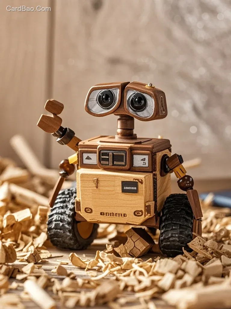 木制玩具,摆件,机器人瓦力造型盲盒造型,简单的背景,有木屑,可爱,卡通,3d,盲盒