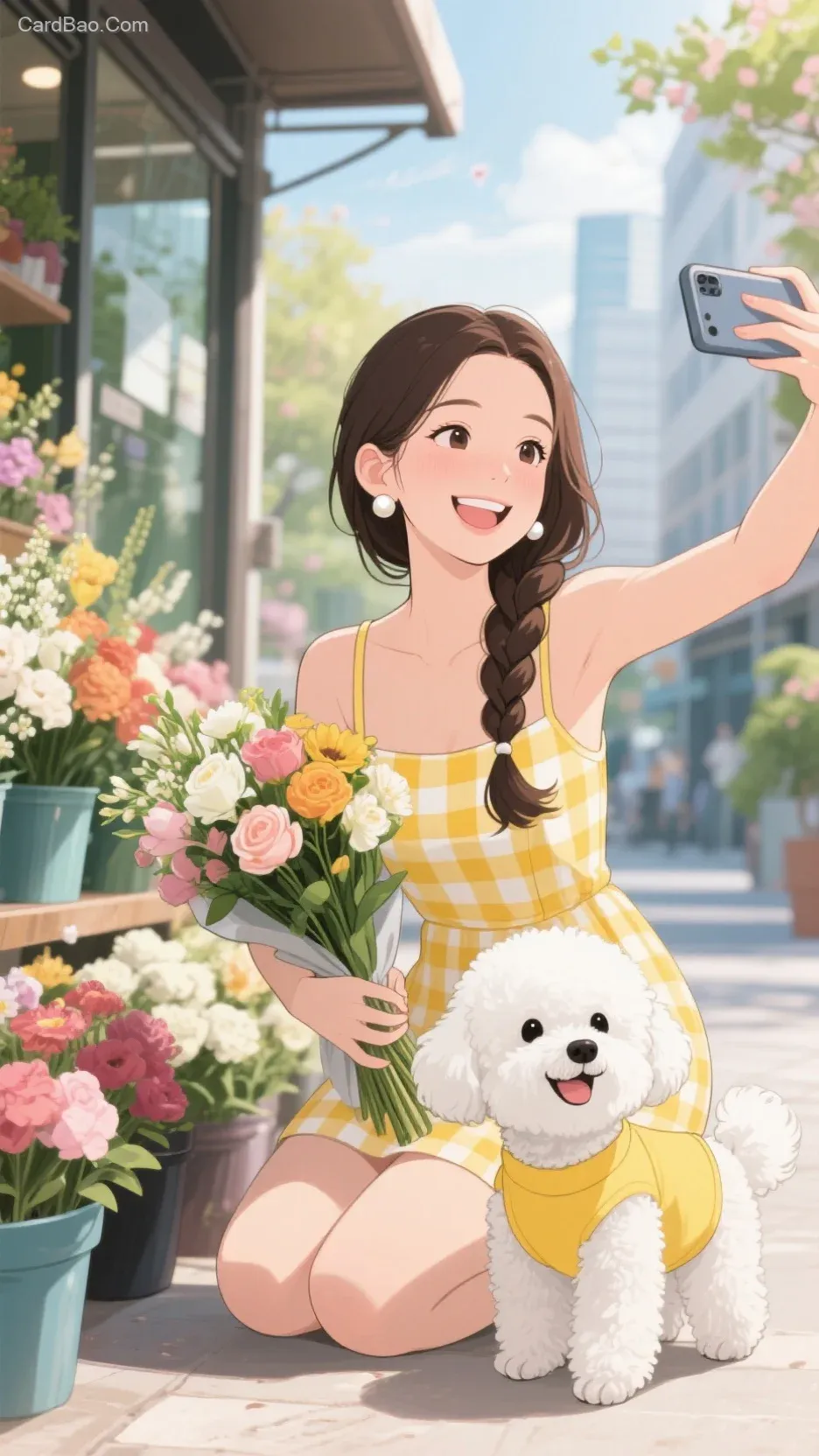 治愈系动漫插画风格,现代都市风格,春天,一个26岁女生,身材高挑有气质,御姐脸,在鲜花店抱着一束鲜花蹲着开心的自拍,旁边有一只白色的比熊小狗穿着黄色衣服,小狗欢快的摇尾巴,晴天,治愈,女生身穿黄白格子吊带连衣裙,微笑的表情,珍珠耳饰,梳着单边麻花辫。