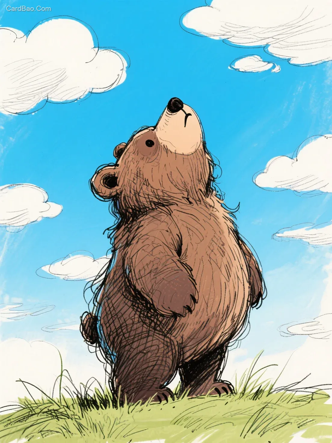 Creative manuscript, pen-inked sketch, messy, super sloppy illustration. Fantasy and whimsy. The main subject is an exaggeratedly shaped brown bear, standing on the grass and looking up at the blue sky, with a few fluffy white clouds floating above.