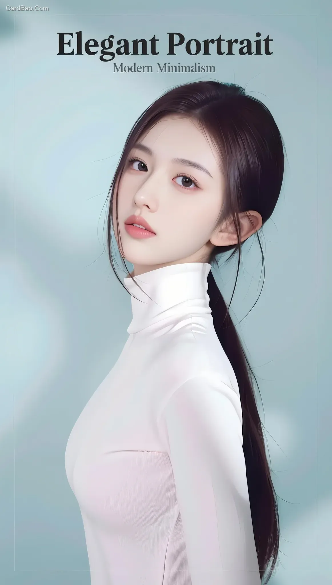 ##"一位年轻女性上半身特写,乌黑长发扎成低马尾,几缕发丝自然垂落。面容精致,皮肤白皙透亮,五官立体分明,眼神清澈明亮,嘴唇微抿。身着贴身白色高领长袖上衣,展现优雅颈部线条与纤细身形。姿势锁定为正面微侧,肩膀自然放松,头部保持水平直视镜头。背景为浅蓝色纯色渐变,无纹理干扰,确保主体突出。采用85mm人像镜头拍摄,光圈f/1.8实现柔和背景虚化,8K超高清画质呈现:高领上衣每厘米12针的精密针织纹理 发丝直径0.05mm的自然垂坠感 睫毛根根分明的1.2mm长度 嘴唇微妙的哑光质感。光线为环形柔光箱营造的均匀照明,色温5600K,整体色调柔和偏冷,风格偏向现代极简肖像。"