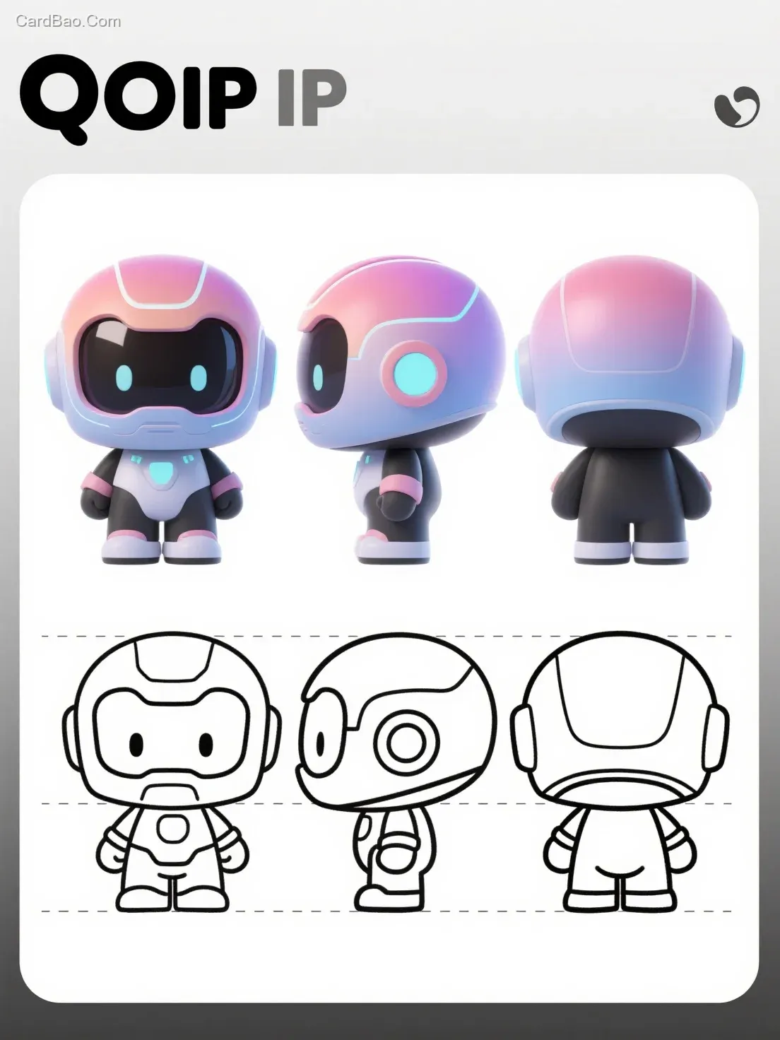 Q版可爱的IP,赛博风格渐变头盔。上面一排展示IP效果三视角,即正面视角、侧面视角、背面视角。下面一排展示黑白单色线稿草图的三视角,即正面视角、侧面视角、背面视角。线条流畅,清晰,唯一性,一致性,统一性,纯白背景。