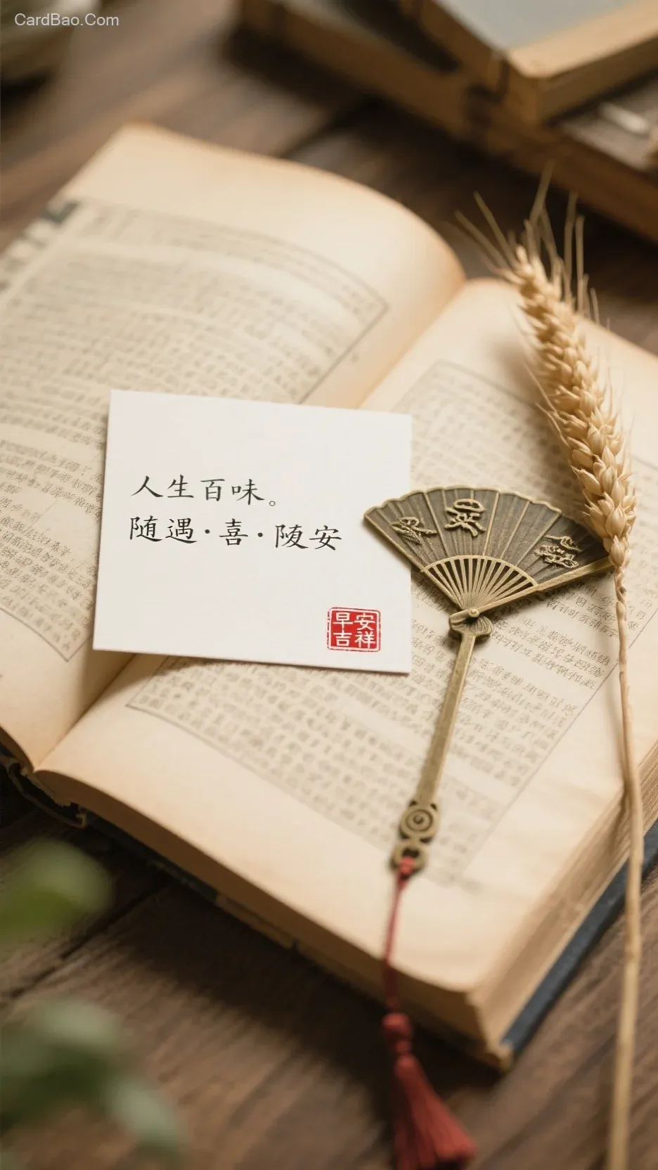 一张温馨的早安图,翻开的古书上放着写有"人生百味 随遇·随喜·随安”的卡片,卡片落款朱砂小印章"早安吉祥",旁有一个古扇形的书签,一侧放着一把麦穗,营造宁静治愈氛围 。大师设计作品,简单但高级,真实