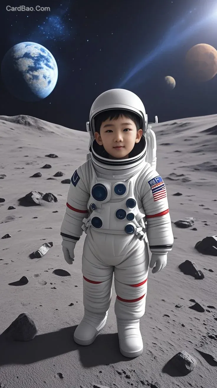 ##一个小男孩穿着白色宇航服站在月球表面,背景是蓝色地球和闪烁的星空,身边有漂浮的太空设备和小行星,超现实风格,高细节3D渲染,冷色调光线与暖色星云交织,未来科技感强烈,画面充满探索的期待感