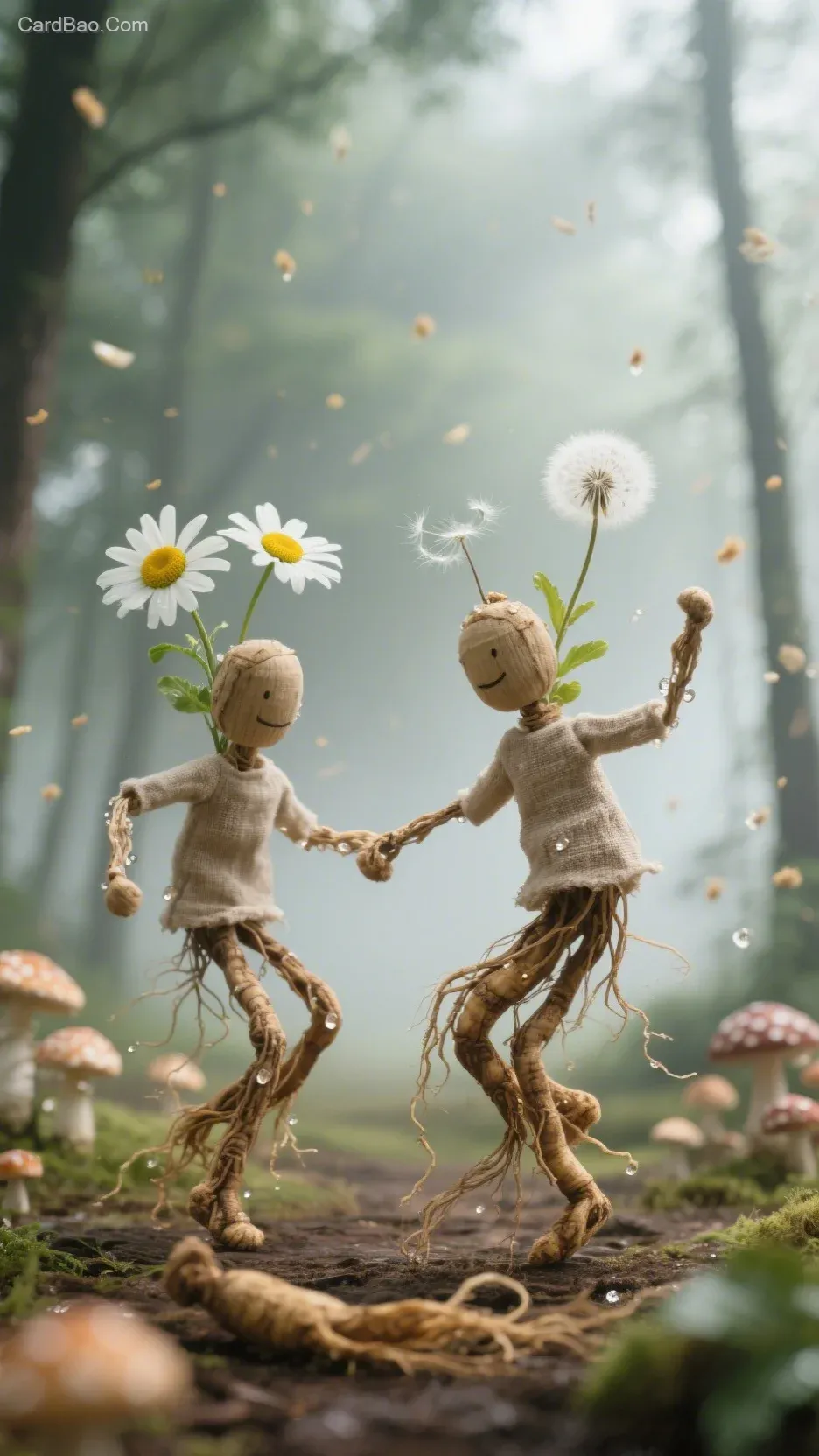 两个根须状四肢的西洋参人偶在林间空地上跳旋转舞,头顶绽放的雏菊和蒲公英随动作摇摆,晨雾中透出柔光在参须上形成露珠反光,亚麻材质的身体带有细腻的植物纤维纹理,浅景深虚化后方蘑菇群,飘落的花粉轨迹用动态模糊效果表现
