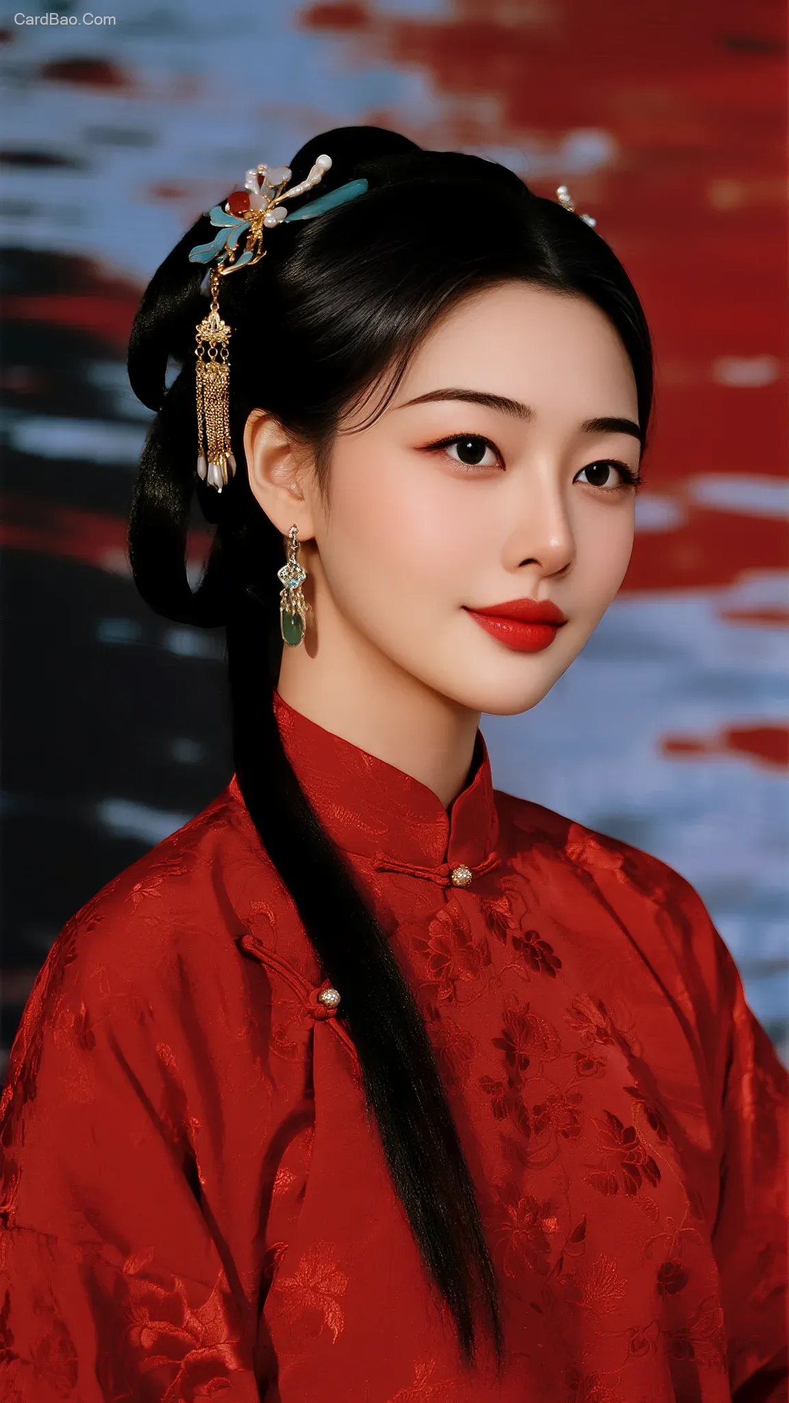 ##正面照片,高清非常漂亮,非常白皮肤,古装美女,微笑,高清,高贵,典雅,绝美,长发发饰,长流苏发簪,长耳坠,浓眉大眼,皮肤白皙,长长眼睫毛,立领,蕾丝红色刺绣花衣服,立领双盘扣,长袖,盘扣,背景虚化深红色水波纹,高清,电影质感。