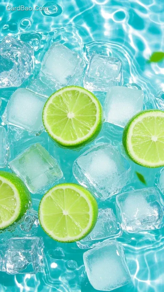 Wallpaper, high-definition image, refreshing and cooling, lime green color, with large ice cubes, small ice cubes, and lemon pieces floating on turquoise water, capturing a cool summer moment, dynamic feel, rule of thirds composition.
