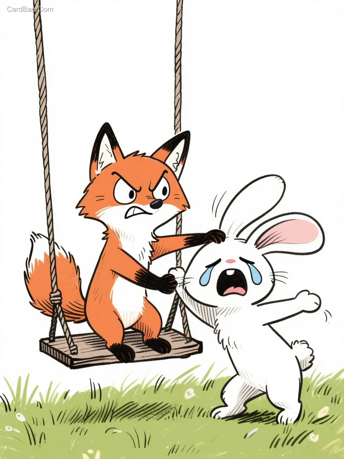 Creative manuscript, pen-outlined sketch, super sloppy illustration. Fantasy and whimsical. White background. Vibrant colors. On the grass next to a swing, a little fox angrily pulls the little white rabbit's ear, and the little white rabbit is in tears from the pain, with exaggerated movements and expressions.
