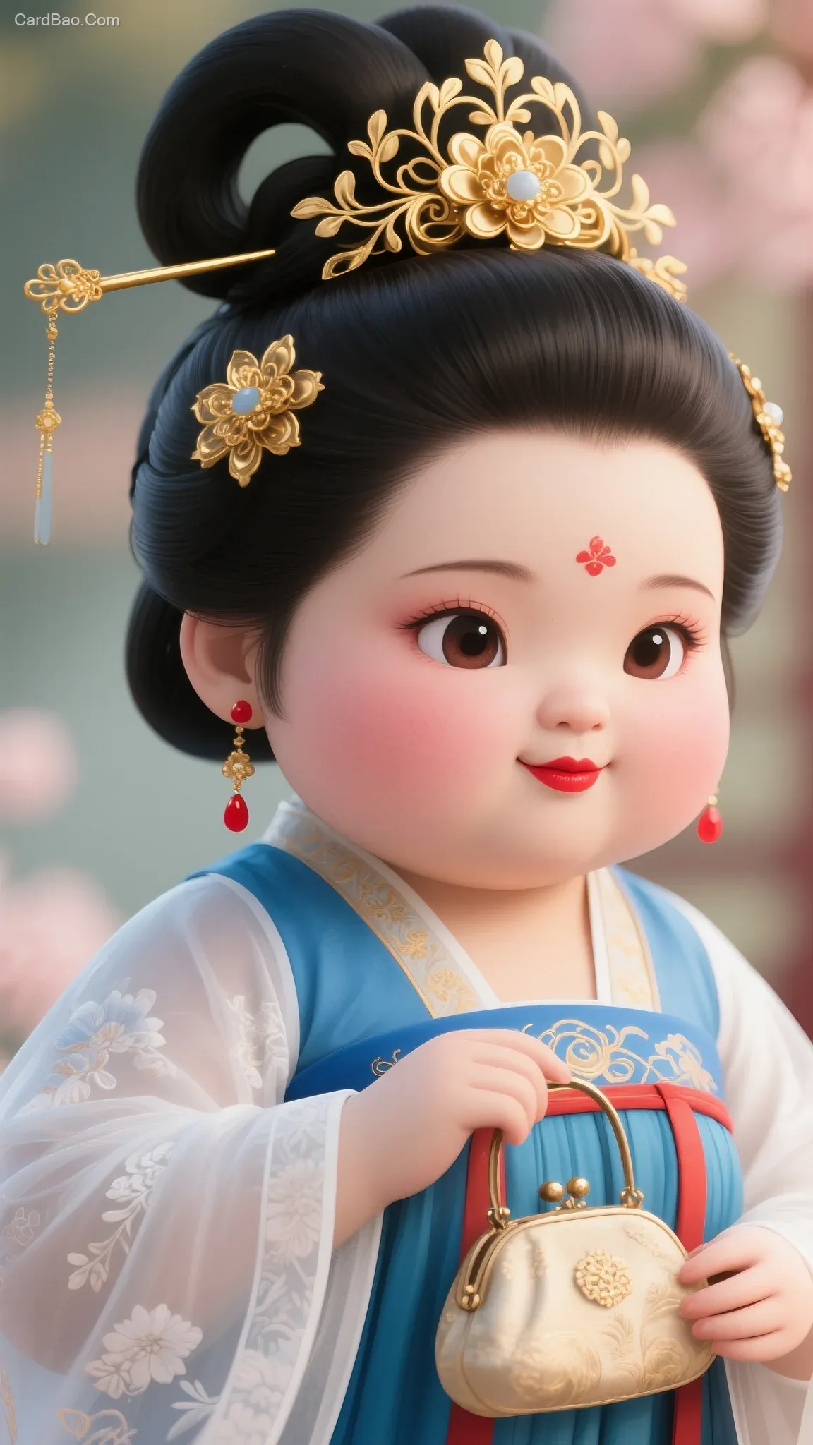 D渲染风格,超现实主义,一个胖嘟嘟很可爱的古代女子,五官精致,大眼睛双眼皮,眉型为细长的柳叶眉,眉色自然,双眸明亮有神,呈杏仁状,透着温婉灵动之感,鼻梁小巧精致,恰到好处地勾勒出面部立体感,唇形饱满。途有鲜红的口脂,嘴角微微上扬,似带着一抹浅笑,流露出亲和气质。她的头发乌黑亮丽,梳成了经典的唐代倭堕髻,倭堕髻插鎏金蔓草纹头饰,发髻高耸且富有层次感,线条优美流畅,一侧别着精美的金色发簪,发簪造型繁复,雕琢着精致的花卉或藤蔓纹样,末端垂有小巧的坠饰,随着人物动作微微晃动,另一侧装饰有华丽的金质花钿头饰,增添了几分雍容华贵。