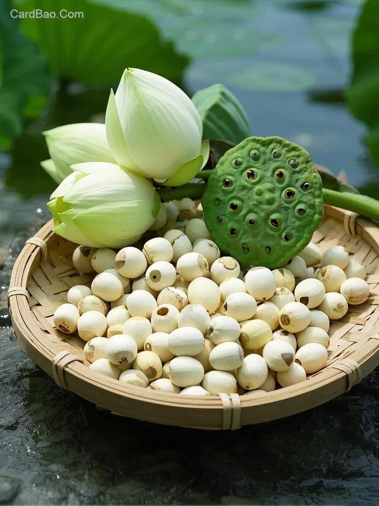 Lotus seedpod, a bamboo-woven basin filled with plump white lotus seeds, with a freshly picked lotus flower and an unpeeled lotus seedpod placed beside it. Hyper-realistic, ultra-high definition, 3D rendered, photographic work.