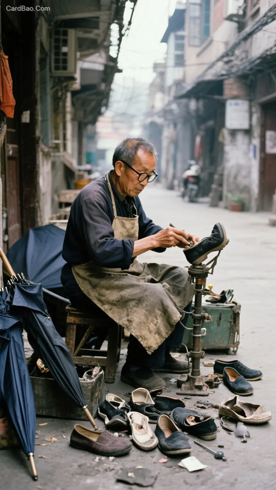 In the 1980s, a shoemaker working in the alleyways, wearing thick glasses and old clothes, with an apron on while repairing items, scattered broken shoes and damaged folding umbrellas on the ground.