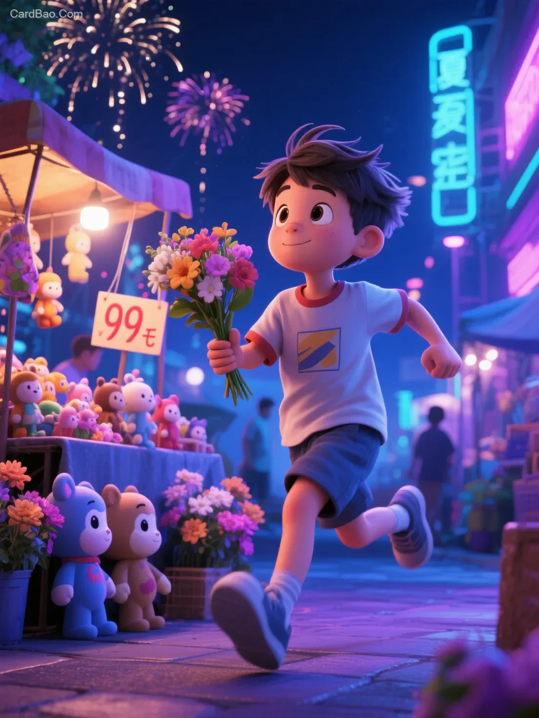 3D cartoon animation style, summer night, a cute and handsome 8-year-old boy is running forward holding a bouquet of flowers, in a dynamic pose with a serious and adorable expression. He has short hair, with strands blowing in the wind. The background is a night market with neon-lit streets, stalls selling dolls, a price tag of 99 yuan, floral decorations, fireworks, and a cyberpunk-inspired retro night market atmosphere.