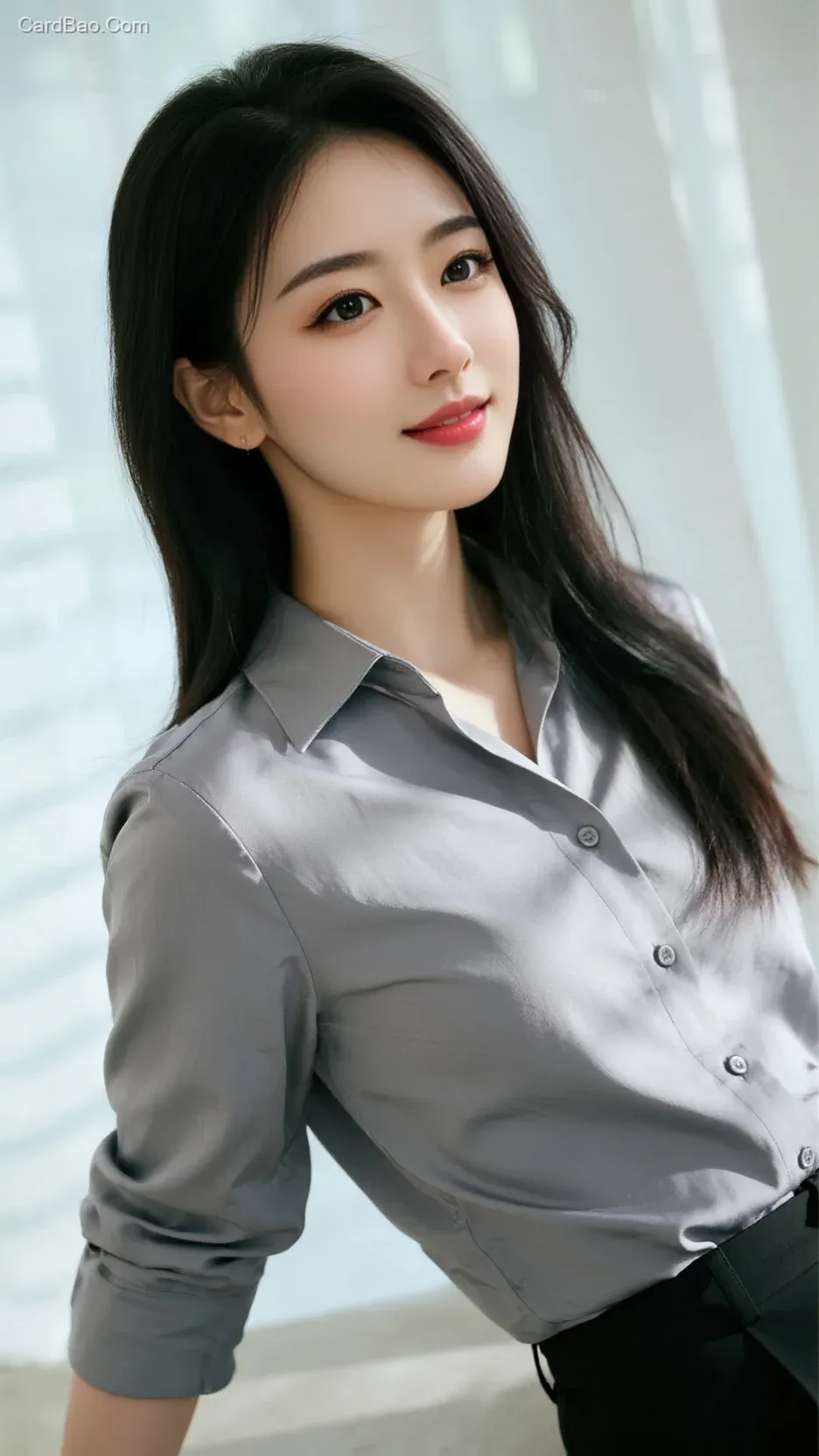 ##一位气质温柔的长发美女。身穿灰色衬衣黑色西裤,她身姿婀娜,肌肤似雪般莹润白皙,泛着柔和的光泽。眉眼含情,双眸如秋水盈盈,细长的柳叶眉微微上挑,流露出万种风情,丰满