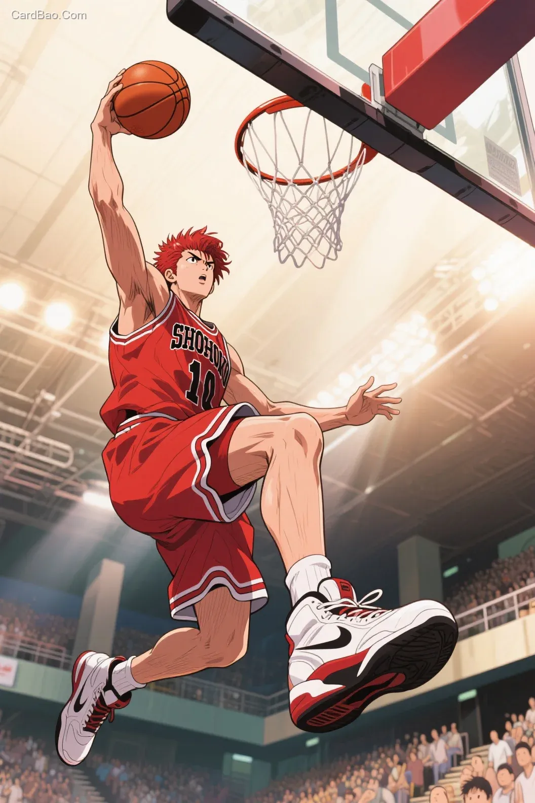 Just like the electrifying scene in "Slam Dunk," the vibrant Hanamichi Sakuragi leaps high into the air, executing a powerful slam dunk. The basketball arcs gracefully through the air and swishes perfectly into the net, showcasing unparalleled explosive energy and passion.