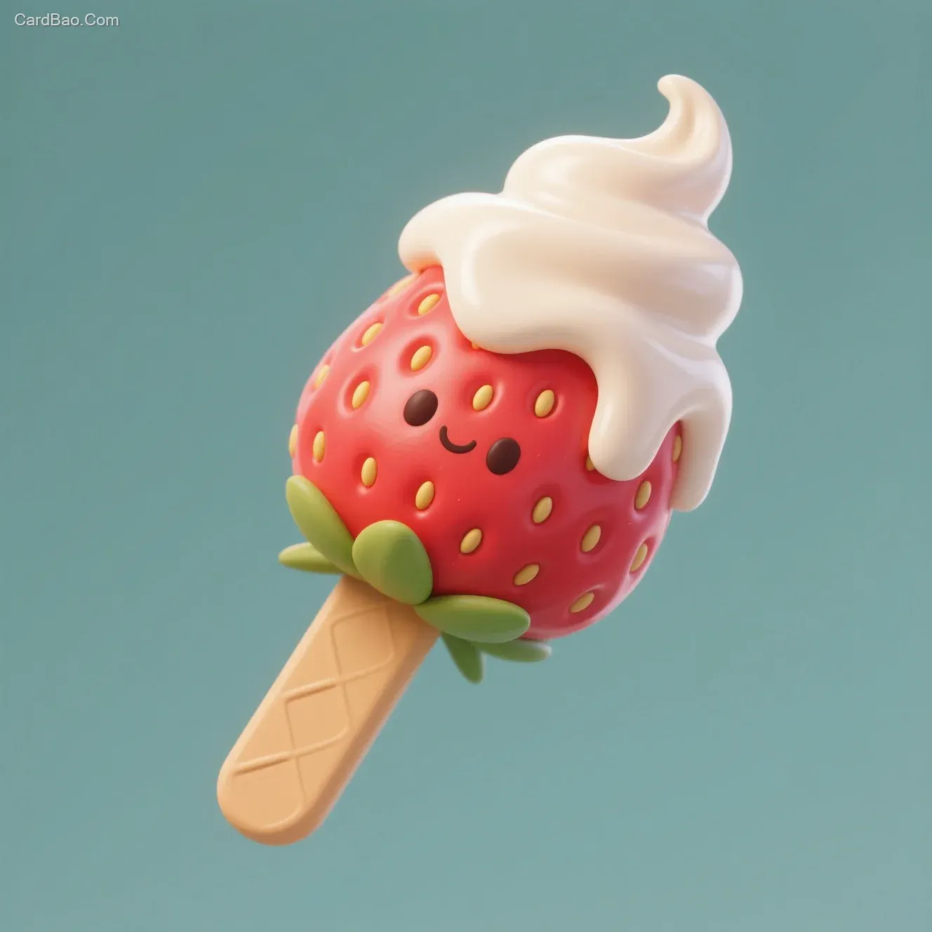 为我生成:将草莓变成变成一根奶油雪糕,奶油在雪糕顶上呈曲线流动状看起来美味可口,45度悬浮在空中,q版 3d 可爱风格,一致色系的纯色背景