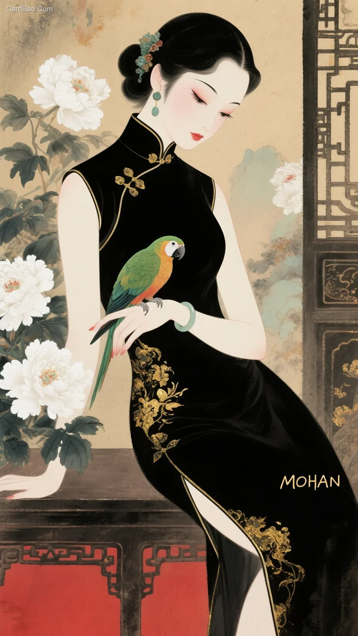 手绘插画,远景,黑色高级旗袍古典绝色美人,低头,大眼,丹凤眼,长睫毛,手上息着一中鹦鹉,几朵白牡丹、中式家具搭配,笔触细腻,金粉绿墨红,高级配色,色彩饱和度高,极致细节,奢华,高清画质。岩彩色彩饱满,色彩晕染,笔触细腻,水墨渲染,右下角签名:MOHAN