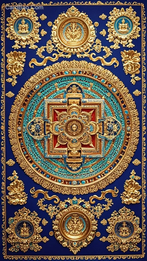 深蓝浮雕肌理底色,外层为多层鎏金边框(内层饰蓝绿几何纹,外层刻卷草与宝石点缀,四角嵌圆形装饰)。中心巨型嵌套圆形图案:最外层是蓝绿渐变八边形星形(每边嵌孔雀羽纹理与小型神像,边缘鎏金勾勒);中层环绕鎏金放射状花瓣(每层纹理细密如织,边缘微微卷翘,呈层叠舒展状);核心为红底金纹同心圆(中心是螺旋状宝相花,周围环绕小莲花,纹理繁复)。圆形两侧对称分布鎏金卷草纹装饰带(带缠枝与几何纹,连接上下元素),上下两端饰金色层叠莲花瓣(边缘带细微锯齿,质感厚重)。整体红金对比强烈,鎏金质感浓郁,花纹极致精致(如花瓣脉络、星形纹理、边框刻纹),具古典宗教坛城的华贵与庄重韵味。