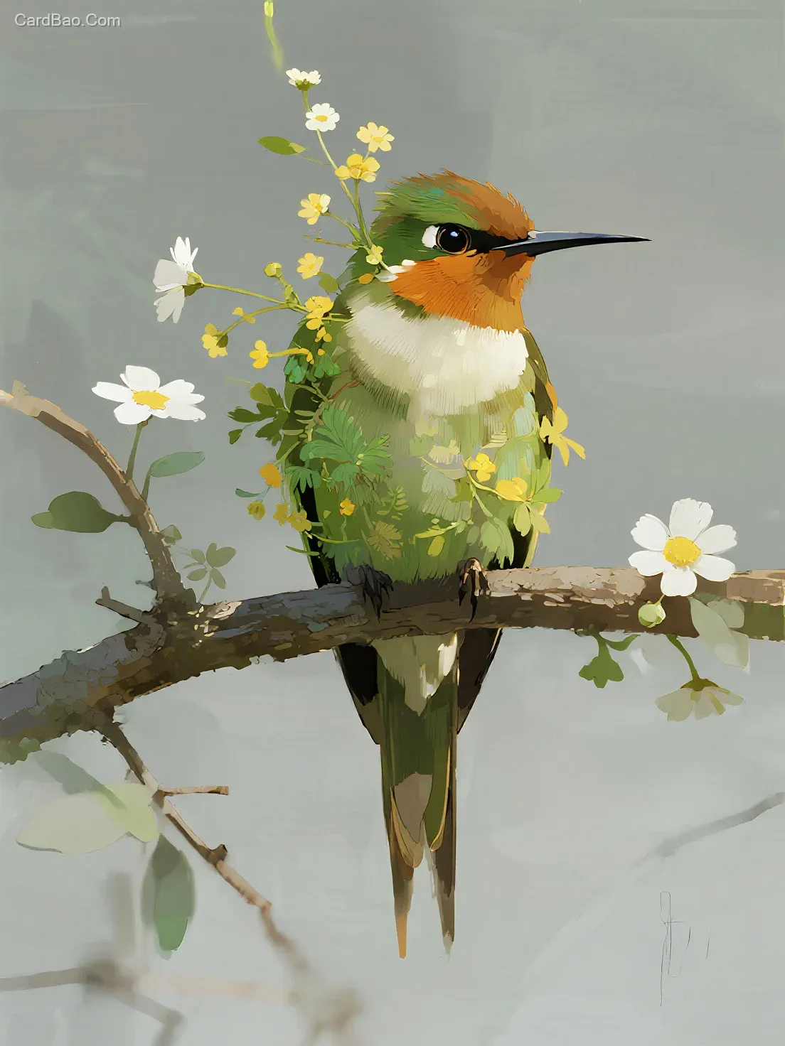 铅笔淡彩创意插画,主体是栖息在树枝上的一只神奇的鸟。正面视角,尾巴张开,鸟身由多种绿色植物、黄白色小花构成独特羽毛,将自然元素巧妙融合。画面风格清新,。背景铅笔本色灰