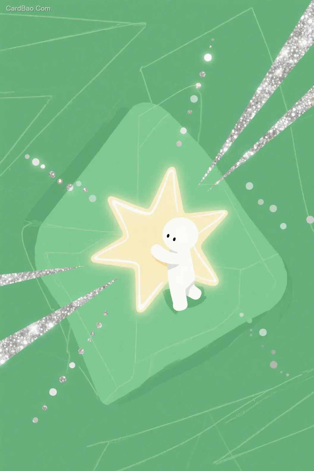 平面设计,插画,珠光质感彗星元素,意识流,白色发光小人抱着彗星,温馨画面,绿色背景